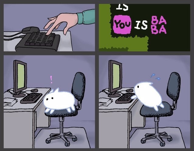 >>730520580>didn't HAVE to chose white and it still would have kept clarity.Baba is clearly meant to be some some sort of sheep by the name, or at least vaguely evocative of the idea of a sheep. Baba also isn't a "character" in any sense of the word— it's a game piece, and more often than not puzzle solutions can involve replacing Baba with something else or otherwise moving the "Is You" modifier to apply to something other than Baba. I broadly agree with the rest of your post, though.