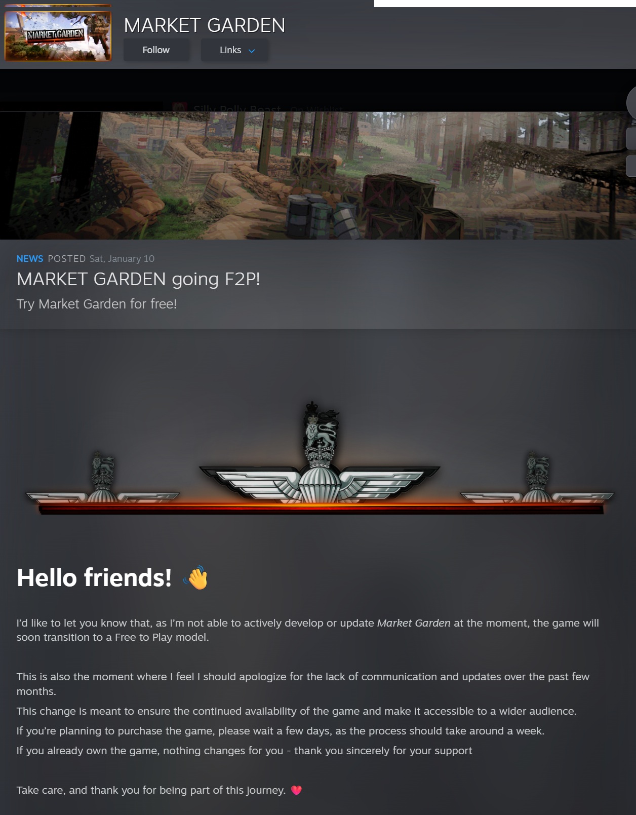 Market Garden is going free2play. Feelsbad but maybe it's for the best if you weren't selling well anyway.