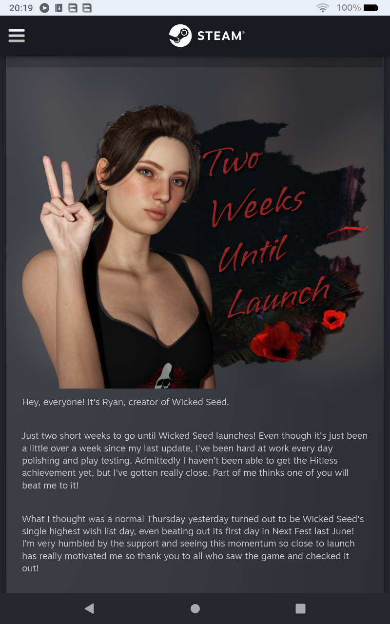 I'm like 95% certain the random wishlist spike on the Thursday he mentioned was because of me. I made a thread about Wicked Seed that really took off on the same day. I love helping indie games when I can.