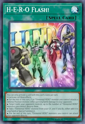 >H-E-R-O Flash!>Normal Spell Card>You can only activate a card with this card's name per turn.>(1) Activate 1 of these effects.>● For the rest of this turn, if an “Elemental HERO” monster you control attacks a Defense Position monster, inflict piercing battle damage to your opponent.>● Target cards your opponent controls, up to the number of “Elemental HERO” monsters you control; destroy them.>● Take 1 “Elemental HERO” monster from your GY, and if you do, either add it to your hand or Special Summon it.>● For the rest of this turn, “Elemental HERO” monsters you control can attack your opponent directly.