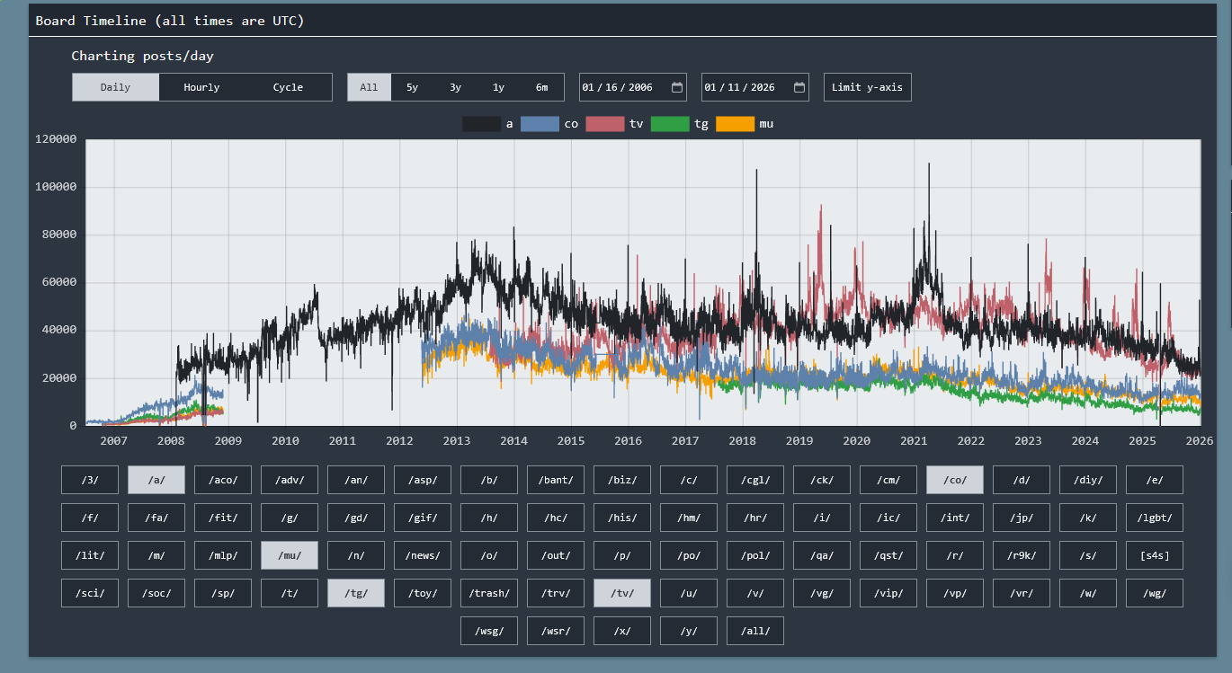 >>730559265The idea of smaller board = higher quality board makes sense intuitively but doesn't seem to bear out in practice. /mu/ for example is slow and ultra low quality. /b/ was once the busiest, funniest, and most culturally relevant part of 4chan, now it's a slow porn dump board. 4chan on average is slower, has fewer users, and is going down in quality. if trends don't reverse then eventually every board will be like /mu/.You can absolutely have a fast moving imageboard with decent discussion and funny posts since that's what we had a decade+ ago and while there were issues there's no doubt it was better than what we have now. The past 5 years show that your line of thinking is a dead end, the goal should be to bring in new (desirable) users and improve the threads that are here now, not hope that everything magically fixes itself.