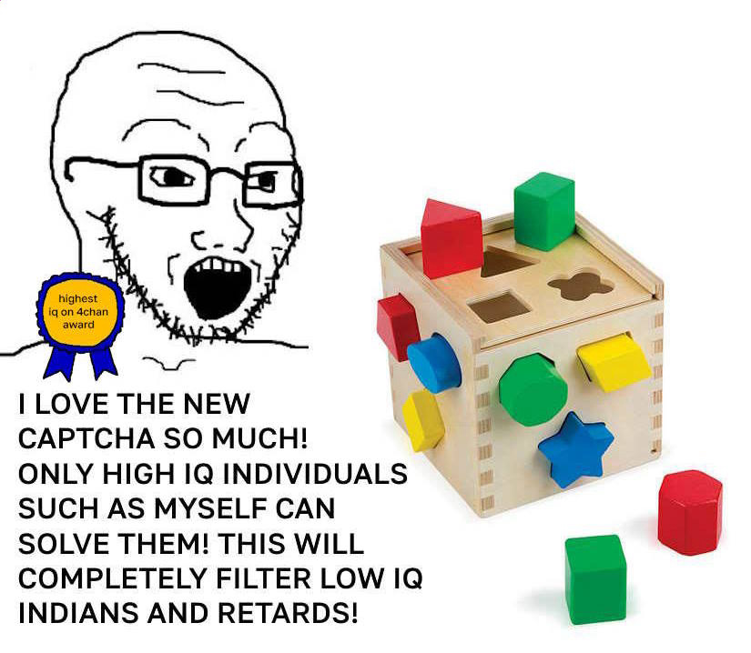 >>730563935>Brownoid copeIt unironically takes less time than the old captcha. I'm sorry you have an iq below 80, perhaps you should visit a quality learing center