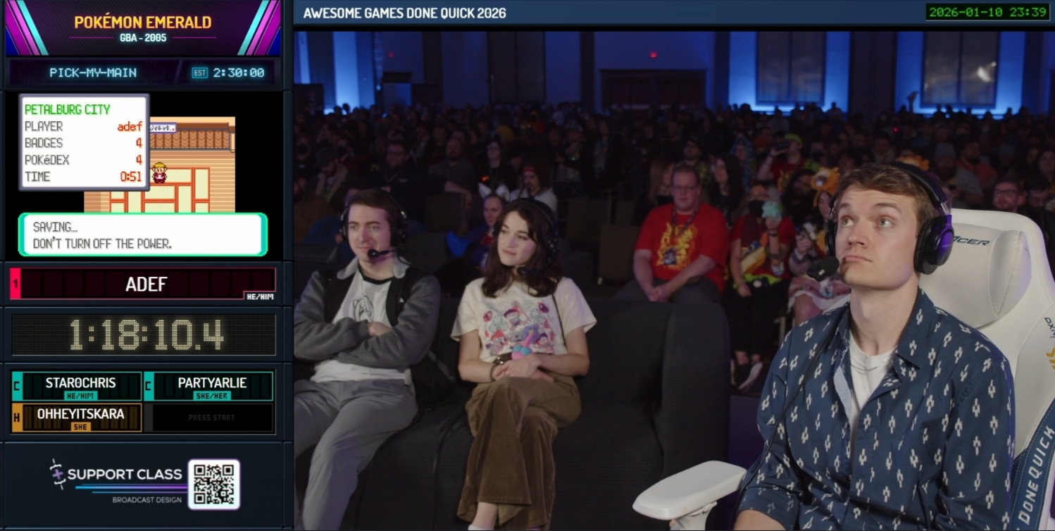 Now: Pokémon Emerald (not a speedrun) Next: The Finale Streams: https://youtu.be/IzylNJUIGwc [Embed] [Embed] https://www.twitch.tv/gamesdonequick Schedule: https://gamesdonequick.com/schedule/62 Previous: >>730558097