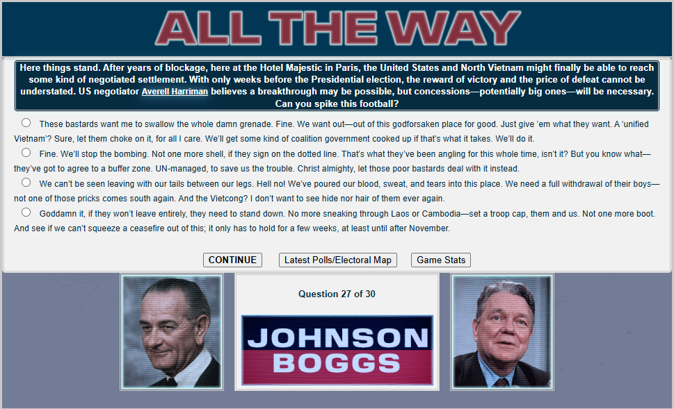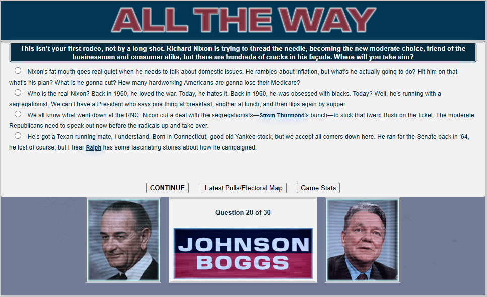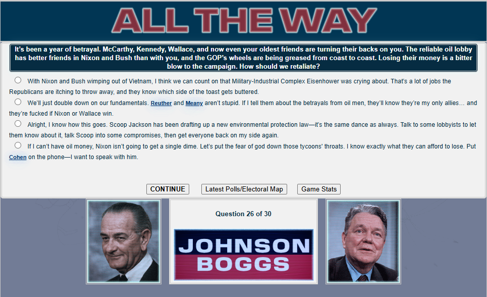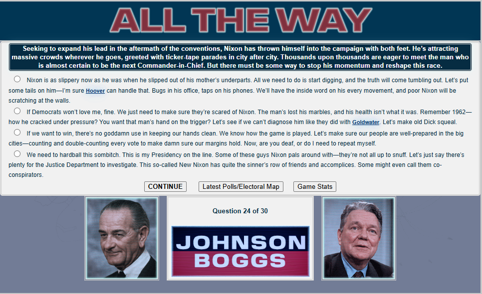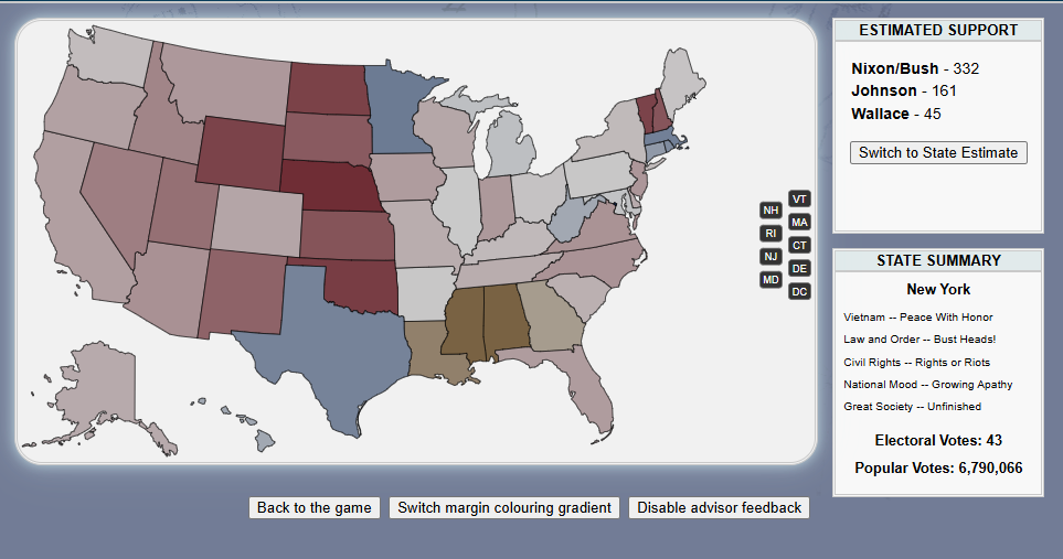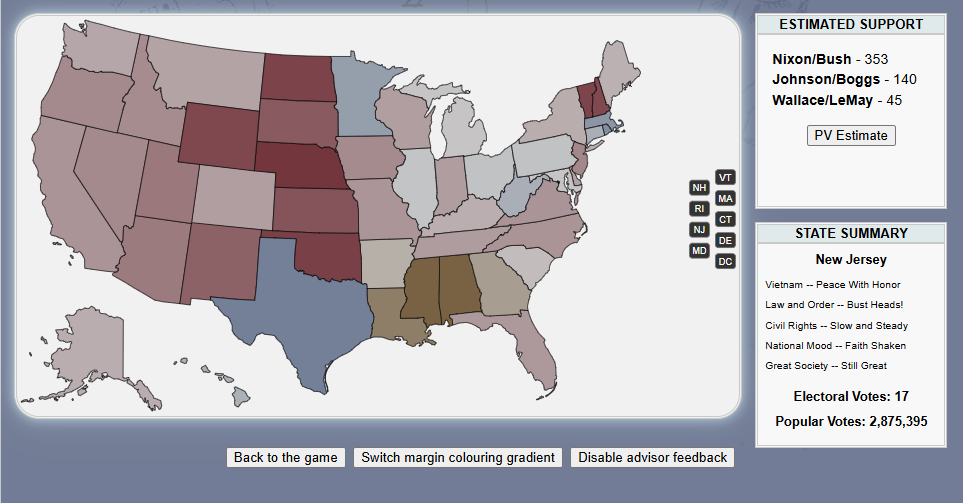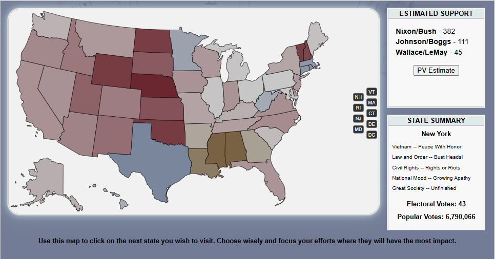 Do you have what it takes to win a presidential election, /v/? Well judging by the last thread, no! But that's okay. Last thread we started to play a LBJ 1968 re-election sim and now we will finish it.