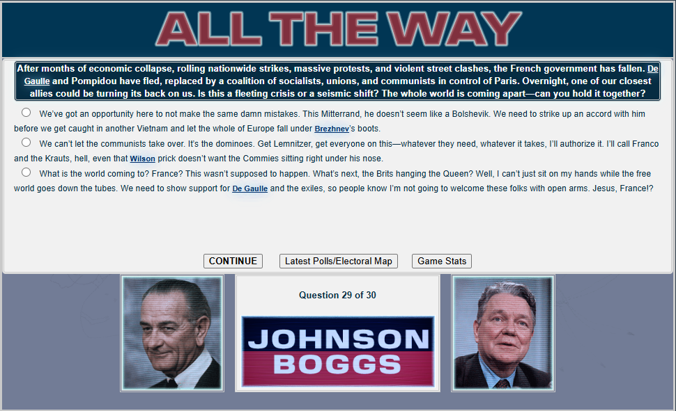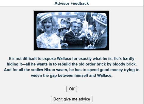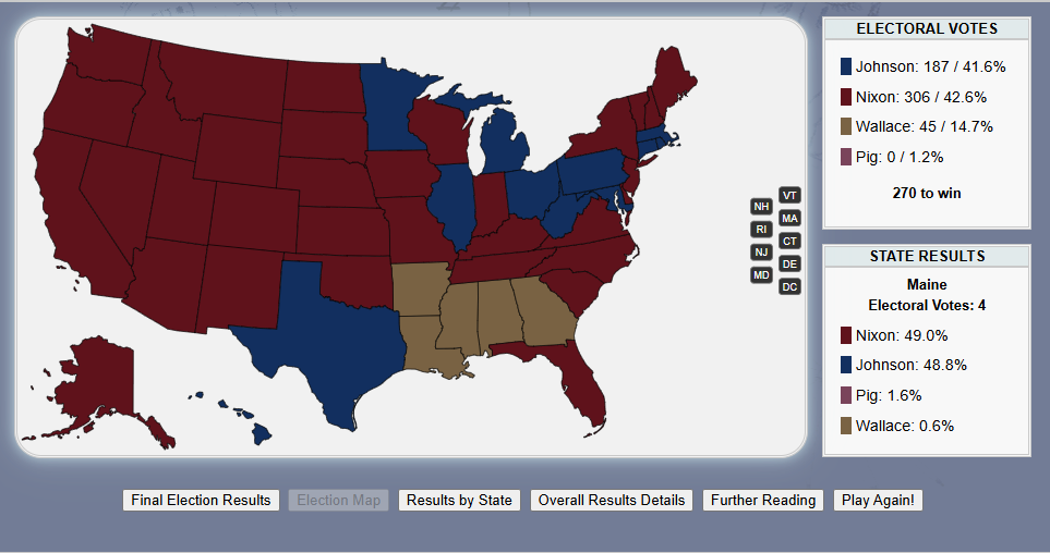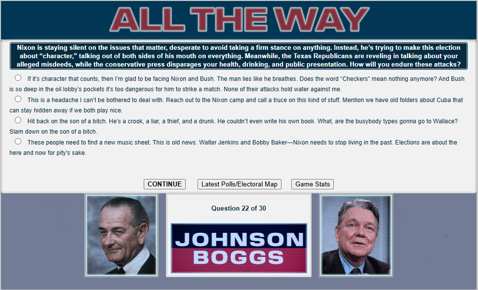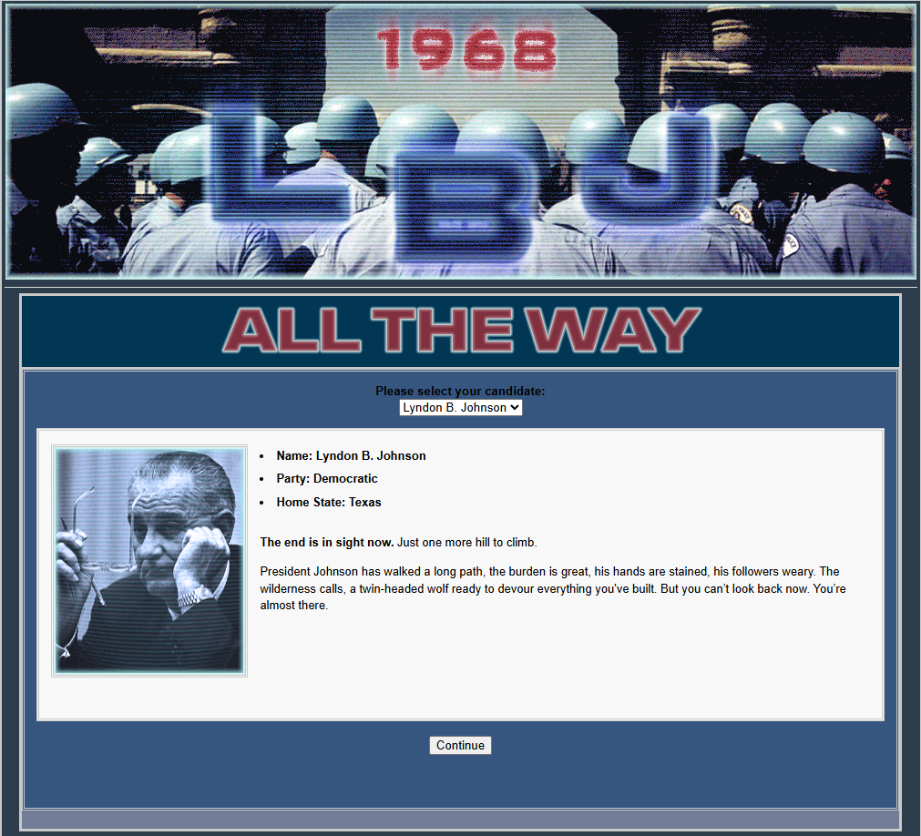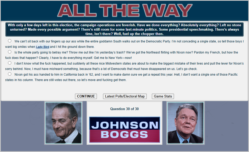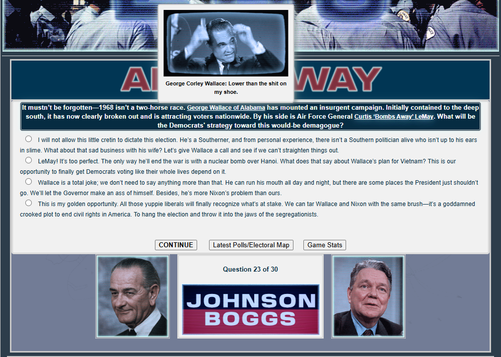 Do you have what it takes to win a presidential election, /v/? Well judging by the last thread, no! But that's okay. Last thread we started to play a LBJ 1968 re-election sim and now we will finish it.