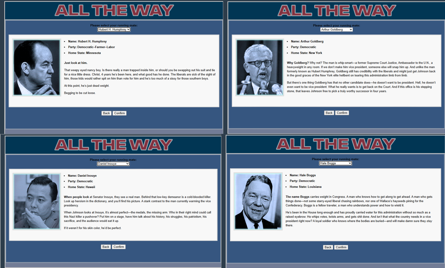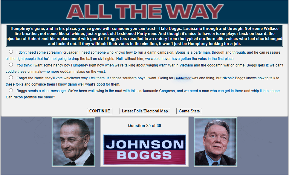 First things first, who will be our boy Lyndon's running mate? HHH is fine but... Do we really need him? (I merged the images for convenience, it doesn't normally look like this.)