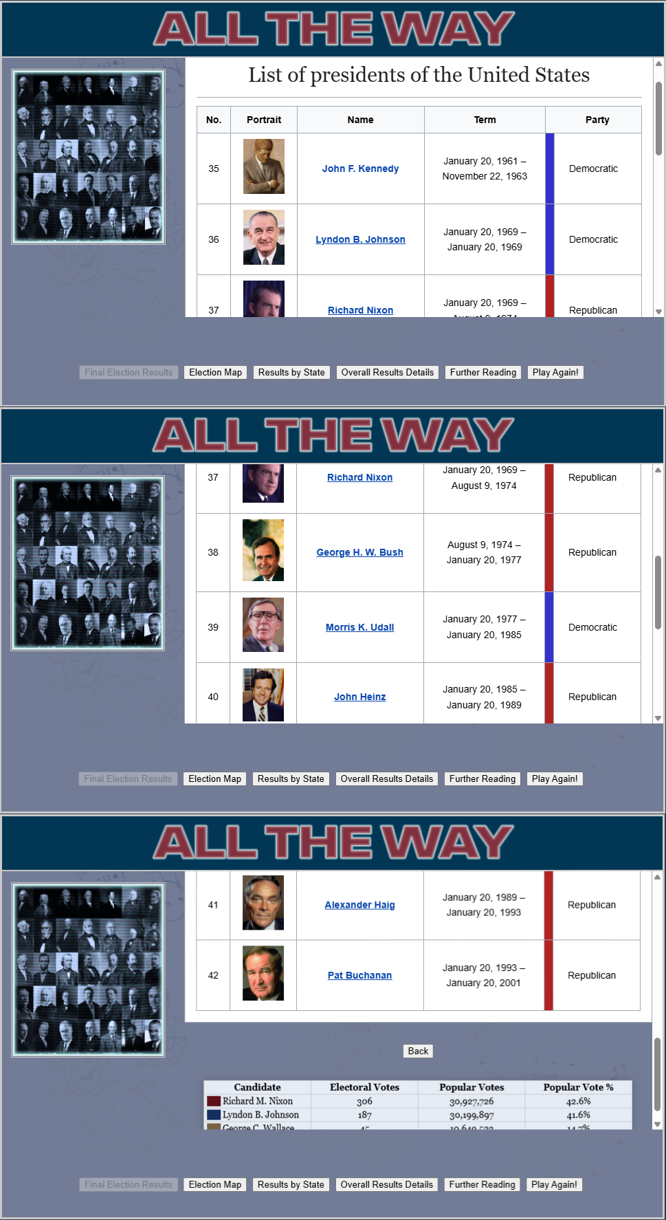 Here is the end Presidents list which is different each time because it is directly changed by the choices you make.