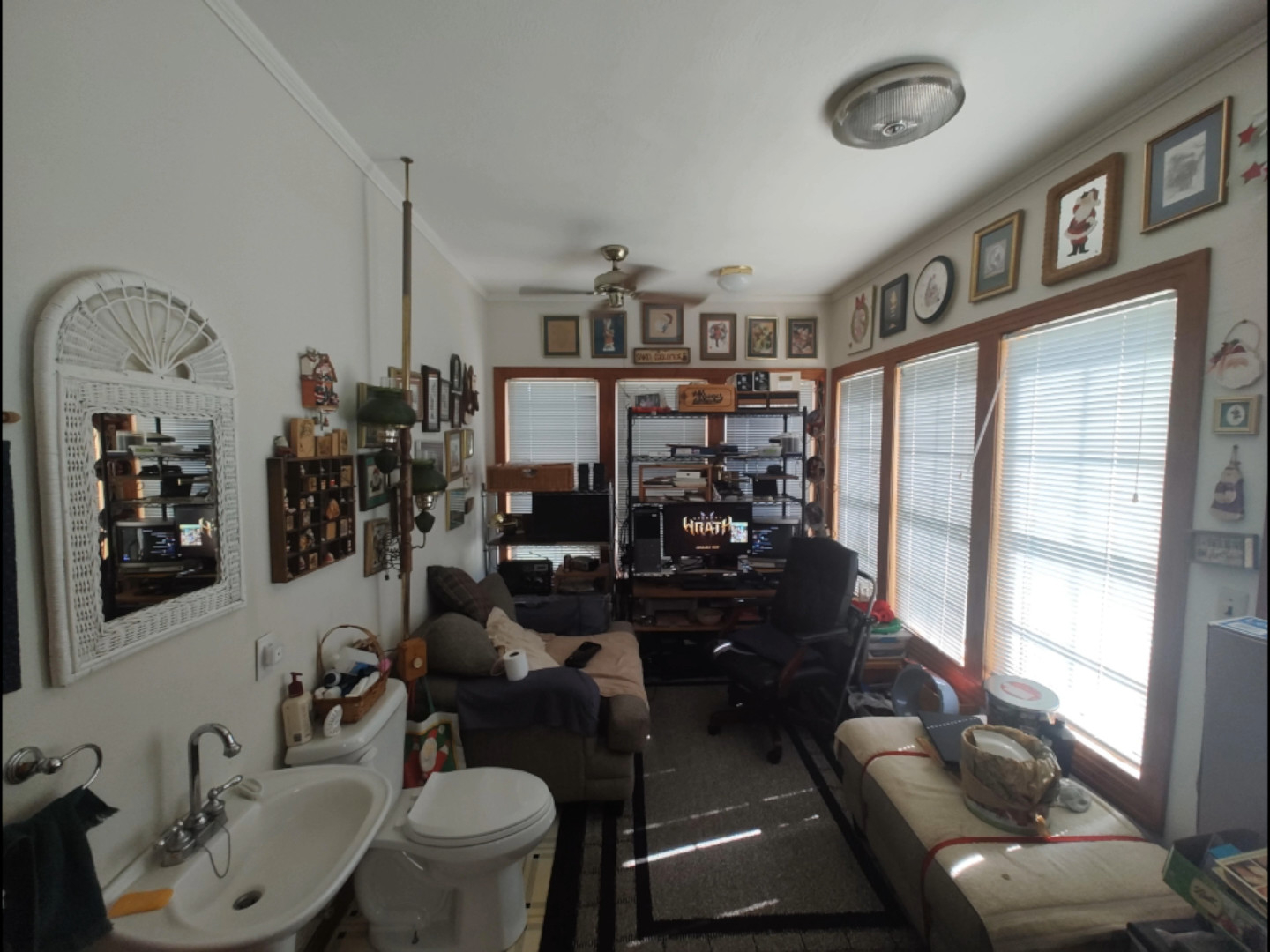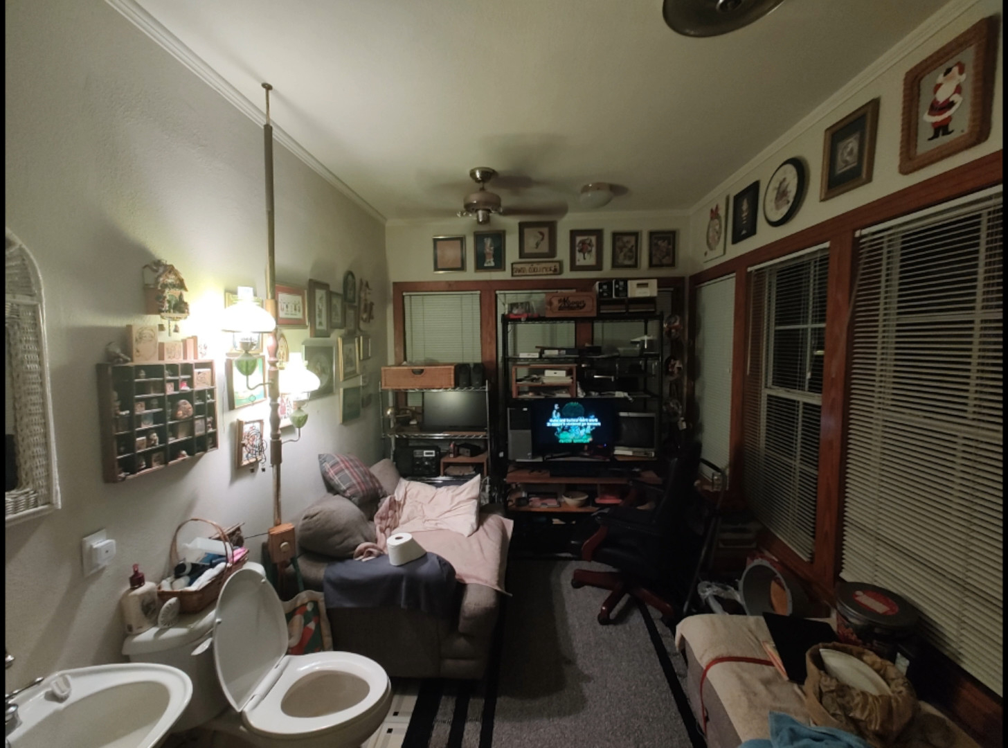 >>730610691why is there a toilet seat and a bathroom in your room and a fishing rod, why does this look like some grandpas fishing surival cottage or a renovated barbershop, what is this