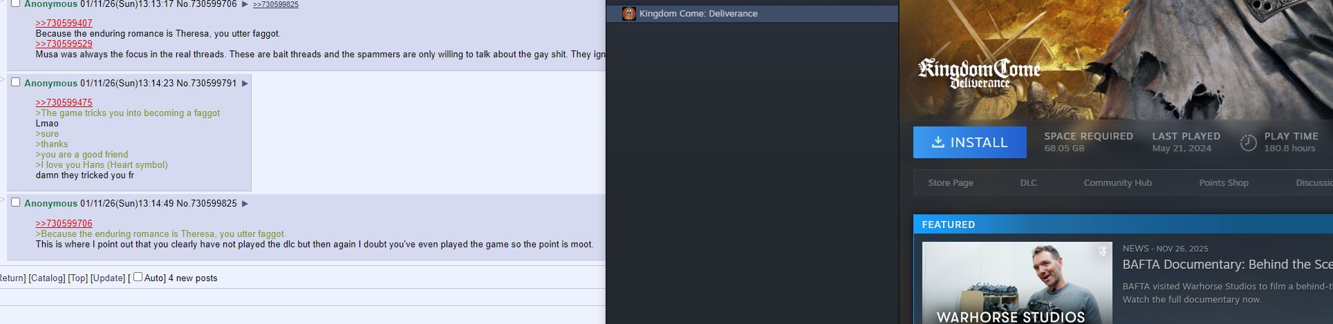 >>730603508I think there's a legitimate concern with Henry as a protag and the lack of choices for interacting with Musa , or others for that matter including female love interests. I have to wonder if this isn't the kind of thing that could be improved by some sort of mod that adds new comprehensive choices and dialog trees based on skills etc, but I don't know if the engine has that sort of capability available. For what its worth, I also hated the limitations of Cyberpunk2077 and some decisions made over there too (especially anything having to do with Phantom Liberty, but others as well). As far as social media faggotry fujos are gonna fujo and social media is going to be shit; don't let it get to you too much. I'd be more pissed if Hans became some sort of whiny bitch the entire game if you didn't romance him, but since it seems someone watching a bro route could never think there's an option for anything else, its okay, especially as it takes a lot to actually unlock the gay shit - its not like the BG3 pre-patch thing where the minute you say you like magic and want to see a magic trick you've committed to going gay with the character, which thankfully they patched out.For Vavra, I think some anon before said that he's basically tried to troll people in the past and act with hostility to those who are critiquing them and while it may not be smart or is questionable, I never got the impression he was specifically trying to be on one 'side' or another in a "Hello my people, I made the game for you not those you hate, buy it!" sort of way, but rather he just reacts with hostility to all the culture war shit and he's been equally hostile to SJWs who screamed about lacking diversity and rightoids who claimed he didn't deliver their promised bohemian hitler fantasy for whatever reason.