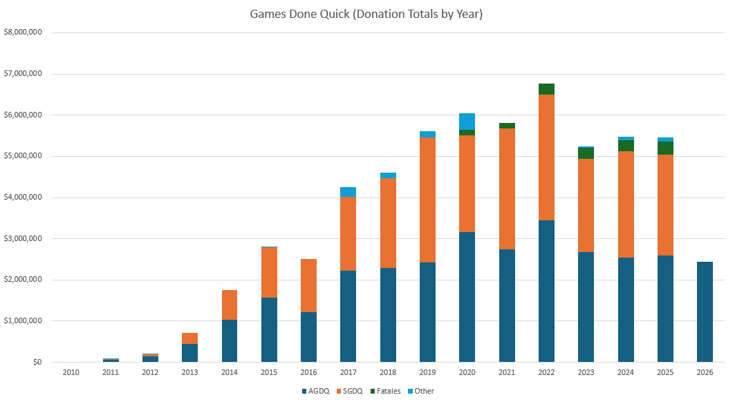 >>730590824Adjusted for inflation it looks roughly like this. 2026 bar uses November 2025 numbers. I didn't adjust all the bars so just look at the totals. Light orange is the projected total if this year's SGDQ has the same proportion of donations to AGDQ as it did last year.Unlike the original graph we can see just how badly the return to in-person events really slaughtered the numbers, and this year is REALLY extra bad for some reason.