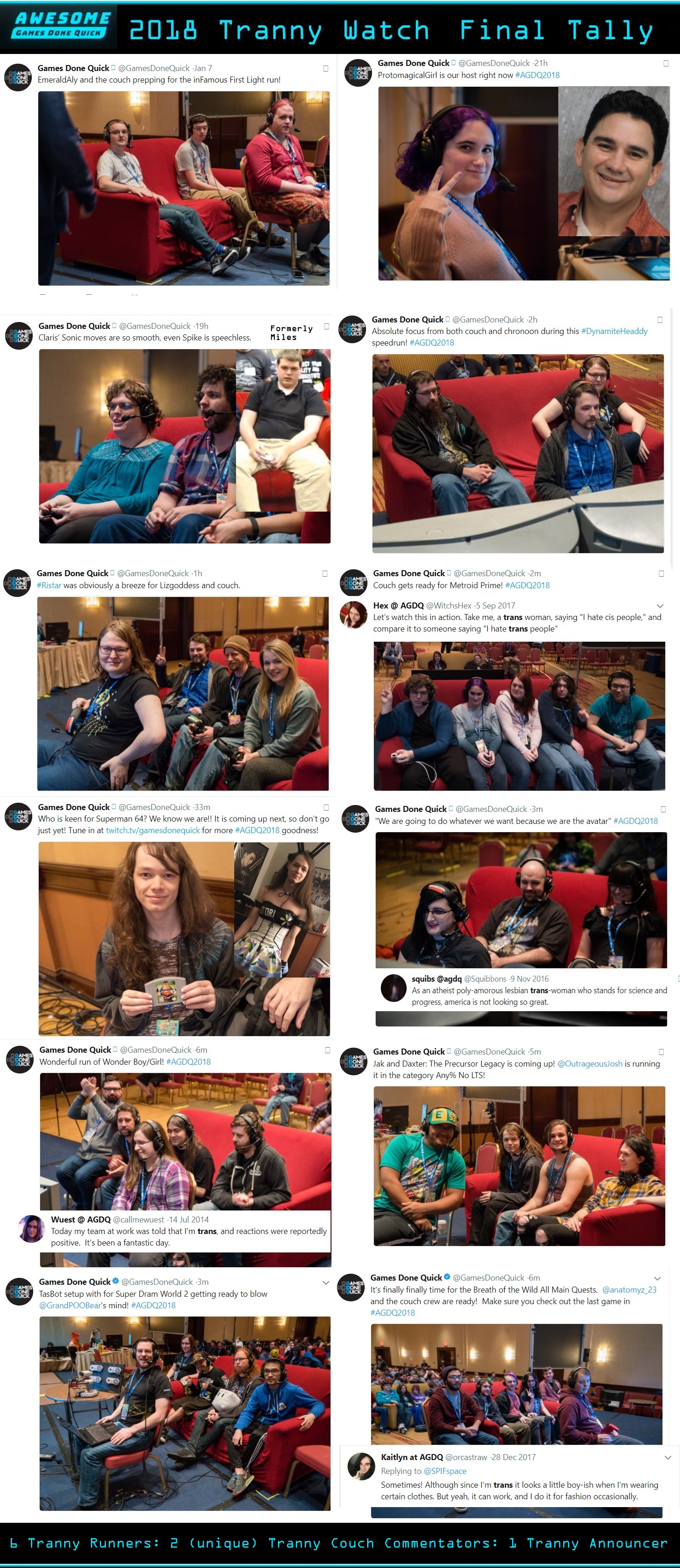Had to be one of the worst GDQ's ever. The constant trans righs shoutouts and all the gay mods for games adding tranny shit to them just made most of this event unwatchable. And as always there was way to many shitty pokemon runs.