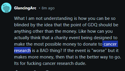 The only way to save GDQ at this point is to free chat and unban everyone. Turn off sub-only mode and only bring the hammer down for people who actually deserve it. Watching old VODs with chat enabled shows a night and day difference compared to what we have now.That will never happen though. Across all of Twitch, literally every channel has open chat to some degree except Games Done Quick. To paraphrase adef last night, "If your worldview conflicts with ours, educate yourself!" In other words, they're too stubbornly invested leftism to care that the chat is dead and this is what's killing the event itself.The silver lining to this is that as GDQ reaches new lows once thought impossible, other small events will keep chugging along. They might not be all that interesting to watch, but there's dozens of them and in a few days it will be back to back with BSG, ASM, RPGLM and UKSG all leading into ESA. Support those events instead, even if it just means putting the stream on a second monitor while you do other stuff.