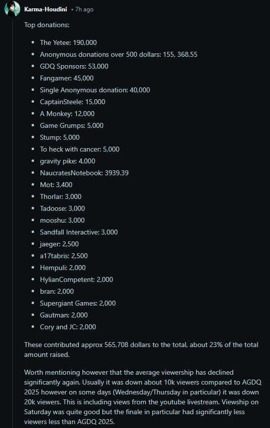 >>730586108I actually think GDQ had a very slight uptick in quality in 2024/2025 (minor, to be fair). But this was a downgrade.That said I don't actually think GDQ is fixable for most of us because the #1 thing it had and can never get back is novelty.