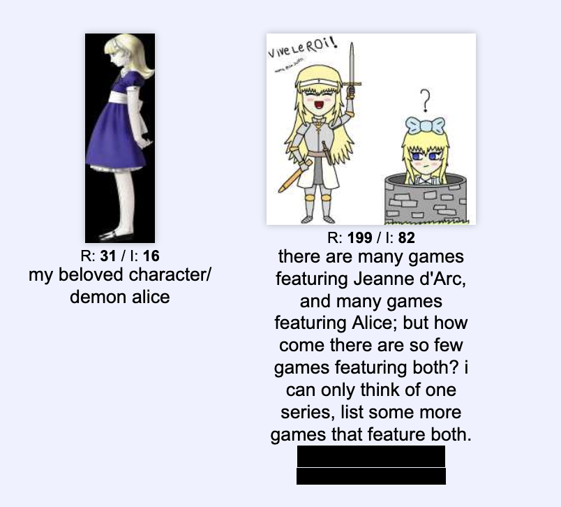 >>730594304one is discussing the alice of smt and the other one is a schizo tupla alice thread usually black souls alice