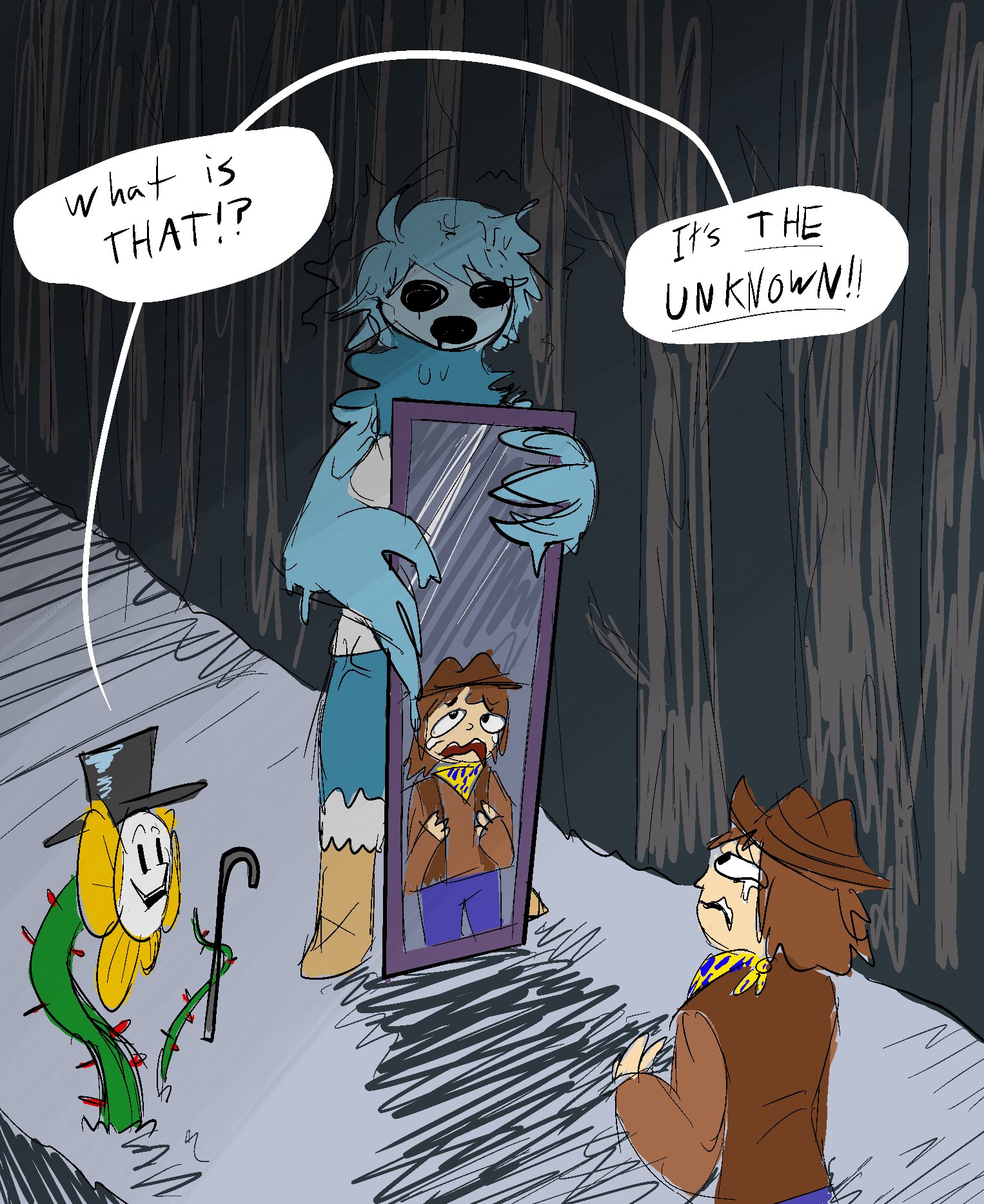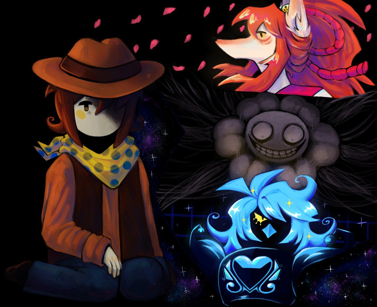 >>730623514He really did, he did want to save the five missing children, Flowey uses it as a way to control him in all routes, and openly mocks him in Neutral by saying "all those poor children you COULDN'T save!" . He certainly is capable of building resolve, but he is still just a kid play acting as a hero, and it shows. His naivety cost him in neutral, by trusting Flowey, and in pacifist, by trusting Ceroba, who even called him out that "What, you'd think you'd jump out here and find them? " He was like a child going in the forest hoping to fight off monsters and saving those in need, encountering a pack of hungry wolves. I find it so fascinating in UTY's narrative that they show that while Clover is the soul of justice and can be capable of having a strong moral compass, he is still just a child who craves love (by staying with Toriel and choosing Martlet when he starts self doubting himself in neutral), who can lash out at even the innocent for an idea which he believes in (genocide), and who ultimately kills the one person who he views responsible for the failure to save the fellow humans, himself.I love this character so much, I know most people don't see it that way and just wash him down to being another boring silent protag, but he is so much more than that to me, and I would have never expected to love him as much as I do, considering I waited for the game all these years and had my own ideas for what the justice soul could be.