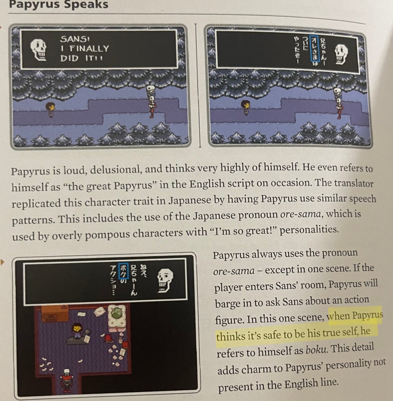 >>730617064Not necessarily. It can be immature, and used to denote younger characters, but it can also be used to denote politeness, formality, and purity, which is a far cry from the arrogance of ore-sama. It indicates to me that Papyrus puts up an extravagant front to impress and entertain people, but is much more polite and humble when it’s just him and Sans.