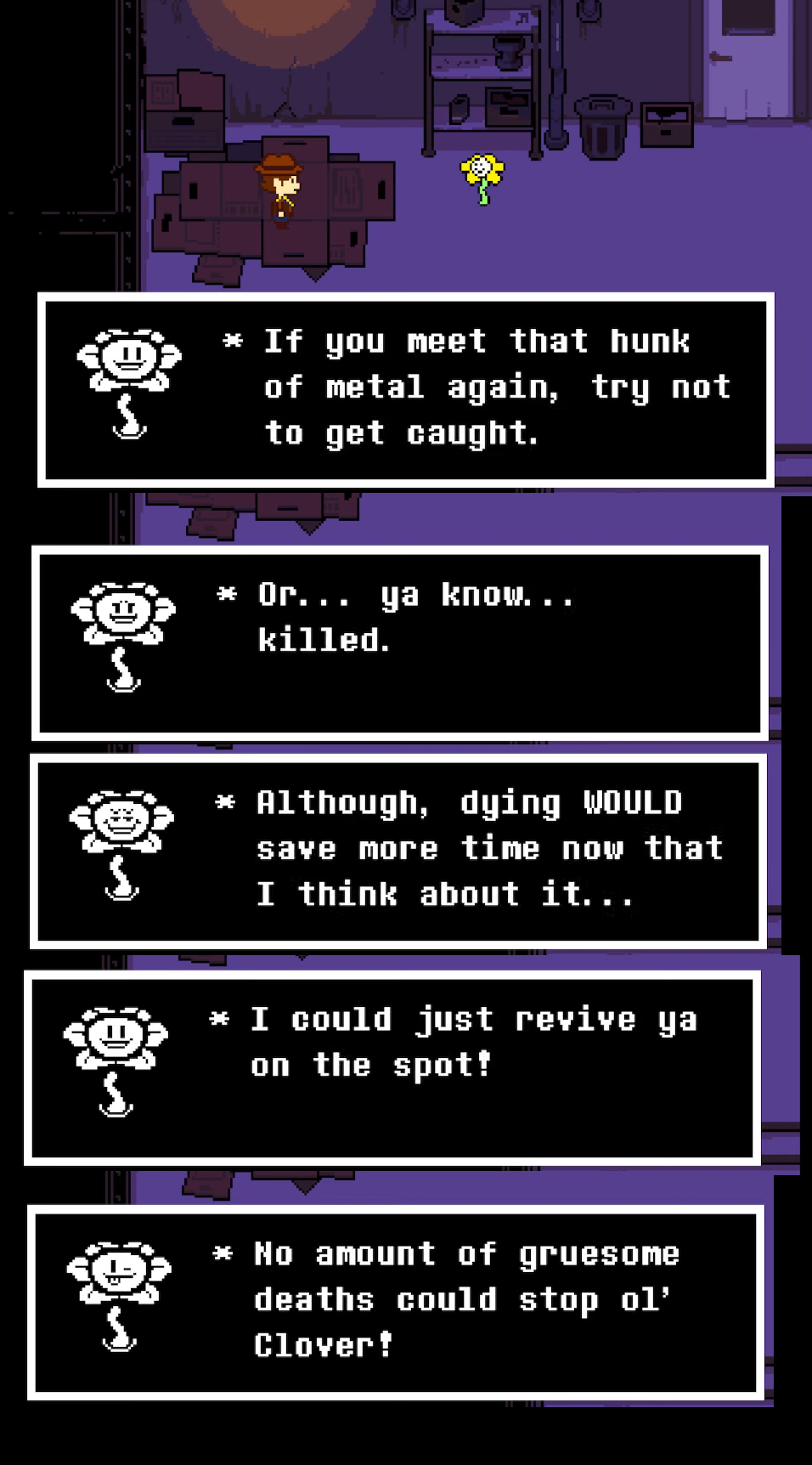 >>730627018She's the one who decides to whip out the syringe, and for that matter, why is a single monster kill the line where Clover completely flips then?None of it makes any sense, there's no reason for either of these characters to have the connections to each other that they have given the amount of time they spend together. UT already had Frisk befriending the main cast pretty quickly, but at least it didn't pretend like Frisk had some special connection with one character over any other, other than if you decide to stay with Toriel at the end of pacifist, UTY acts like Clover and Martlet had some kind of inseparable bond, despite the fact that they know each other for like five minutes in any given route, even pacifist.