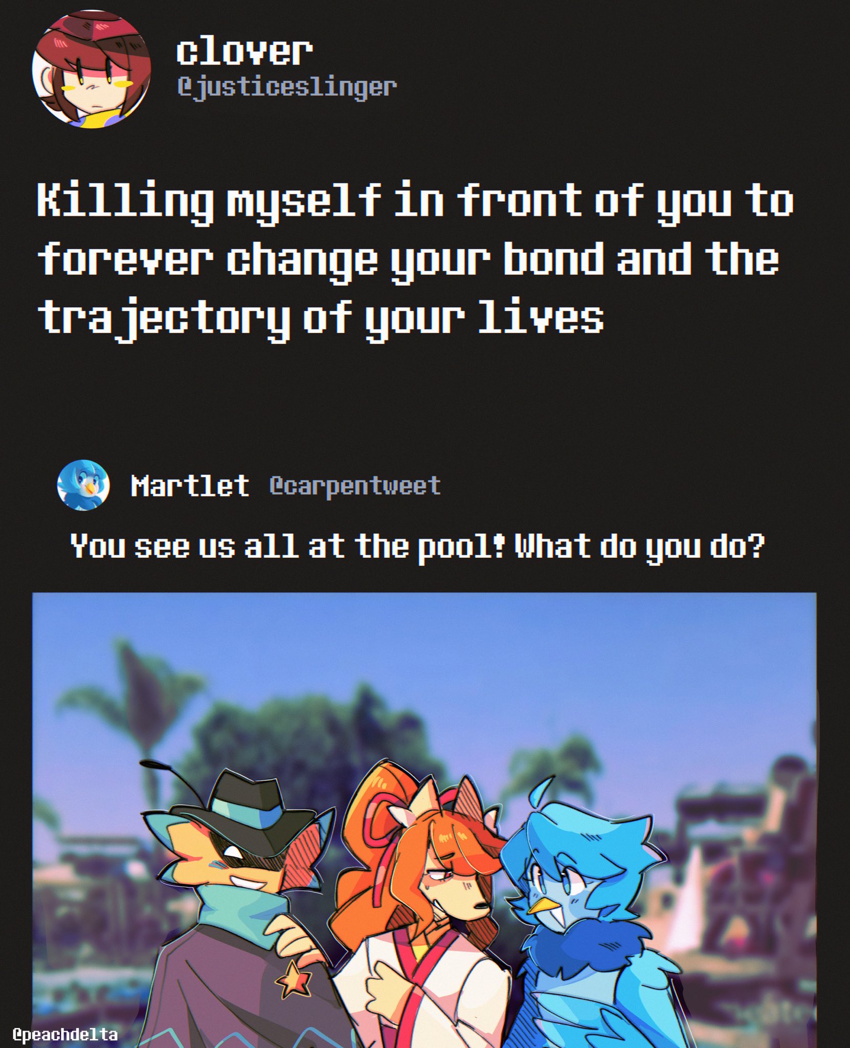 >>730627941and to elaborate on that with starlo, I imagine him crashing into the ground hard after clovers death, but forcing himself to stand up and pull the others together, because the thought of the people clover cared about falling down from misery would tarnish the one thing that still keeps him getting out of bed most mornings.
