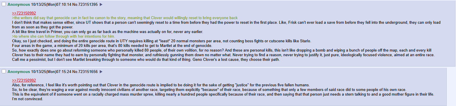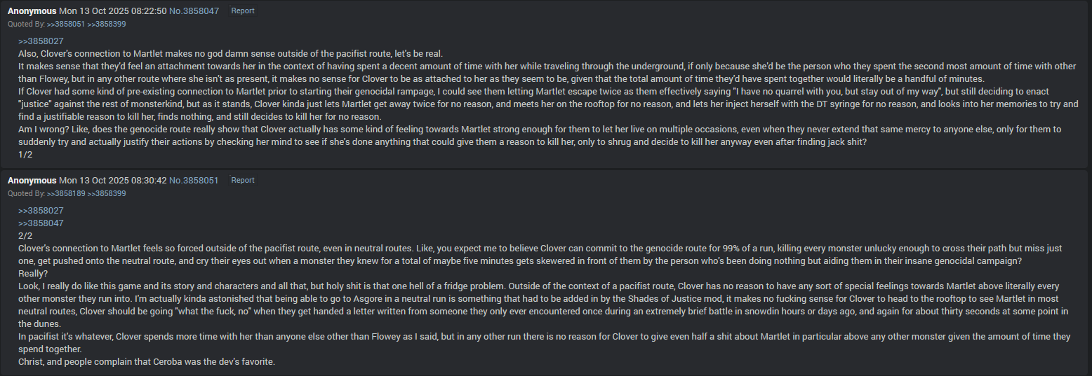 >>730627705>For the exact same reason a single monster in Hotline is the line for Sans. It's a game, it's all numbers.I already explained that. For Sans, it's not just about the amount of monsters you've killed, it's about the actual consequences of your actions, namely the whole thing with transferring control over the world to Chara, who seems pretty content to just erase the entire world forever and leave it at that. And yes, there are implications that Sans is aware of this, on some level, based on his "you REALLY aren't going to like what happens next." and "don't say I didn't warn you." lines. Sans fighting you in the genocide route exclusively isn't him trying to kill you, it's him taking his one last chance to try and talk you down from handing the world over to someone worse than you and potentially destroying the world forever.In UTY, what exactly is the reason for the threshold being 79 kills? Why is that one last monster the straw that breaks the camel's back? It's not even like Clover's plan is to explicitly exterminate the monster race, they only travel through the back roads of the underground anyway, so anyone living in the main Ruins, Snowdin, Waterfall, Hotland, etc, is totally fine, and we know from the various neutral ending dialogues in UT that that's most of the underground's actually populated areas. So with that in mind, why does Martlet make her stand against Clover in the genocide route like that? What changed, why is 80 kills so much worse than 79?