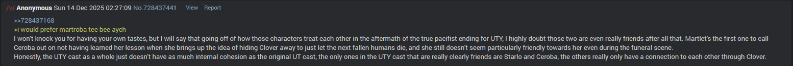 >>730626085>Martlet offering him the one thing he's only wanted on a near complete aborted genocide, why wouldn't that be a big deal to him.It feels forced because the difference between Martlet trying to offer Clover a better life and Martlet trying her hardest to kill them is a single monster's death, that's why. UT handled this in a fairly smart way, with the reason Sans doesn't fight you in most routes even when he acknowledges that you're a terrible person who's done terrible things is because he knows he can't actually stop you with violence, and because he knows it can all just be reset anyway. He only fights you in the genocide route because that's the one route with irreversible consequences, namely that completing it transfers control of the world over to Chara.In order to complete the genocide route in UTY, you need to kill about 80 monsters in total, not counting boss fights or cutscene kills, but if you miss a single monster at any point, the route's aborted and you're just doing a murder-heavy neutral route instead. So, why exactly does Martlet draw the line at 79 kills to 80? Why is the difference between her trying to get through to Clover and offer them a better life a single dead monster?There is no in-universe reason, it's just something the devs made because they wanted to establish some kind of connection between Clover and Martlet in every route, despite there not actually being a valid reason for them to have any real connection in 99% of cases.Same shit with Clover apparently bawling their eyes out over Flowey killing someone they knew for a grand total of like five minutes and who they only ever tried to kill to begin with, it's just forced.