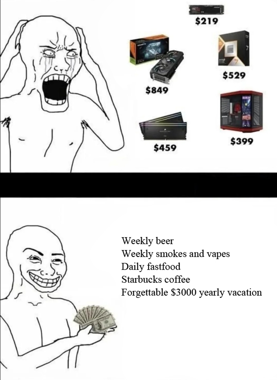 >>730633423I think it's supposed to strawman someone being picky about comparatively cheap pricing on clothing compared to pc components which they will happily buy without hesitation.