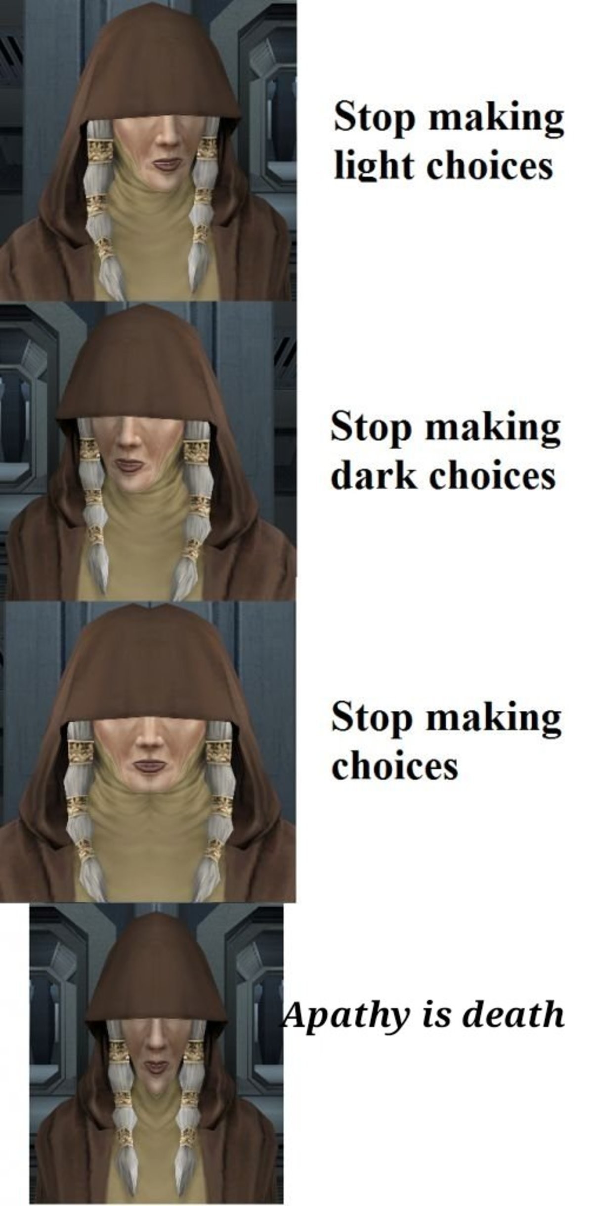 Then why does she bitch at me for making dark side choices