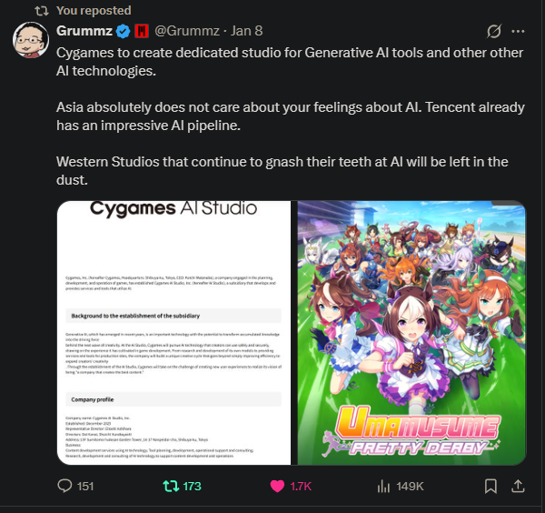>>730628917gain the edge in what? slop creation? The west doesn't benefit in the race to the bottom, the third world does. Its actually more beneficial to just let China slop it up and ban the sale of their media in your market. Ultimately this is a race about shamelessness and materialism, it is better for those industries to go extinct than to compete on who can violate western morality the hardest.