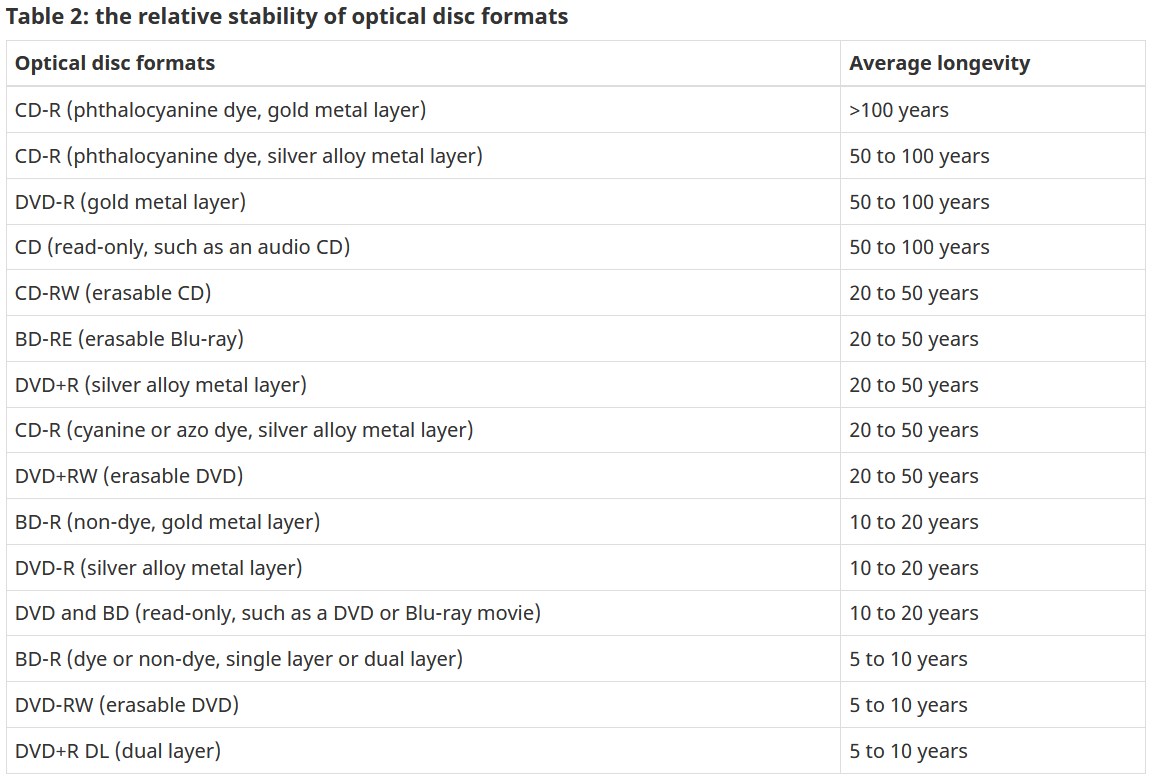 >>730651974shit canadian study debunked by other studiesalso funny how they dont addd m-disc which lasts 500+ yearsalso the blu rays i burned back in 2015 still works without a single bit missing, which accordding to this shitty debunked study all my bd-r should be unreadable by now
