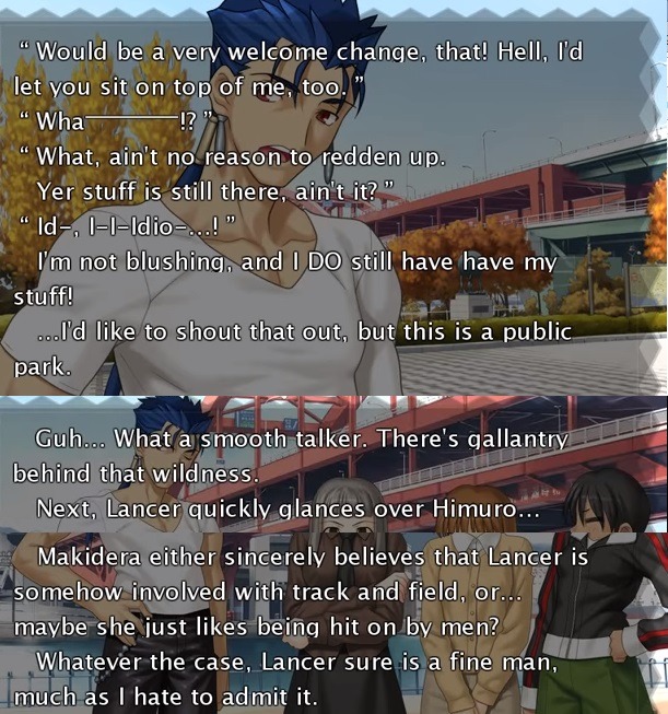 >>730651853Shirou is where the legendary Tohsaka's anus line came from. Calls Sakura an educated whore inside his head, told the king of britain to stay put as a woman.That shit in the image is just to take a shit on Cu because he's the jobber who atleast never misses the mark with shitposting.