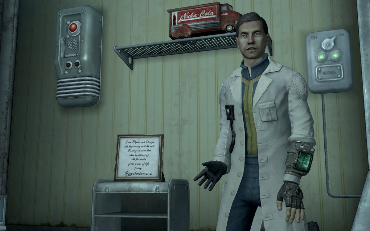 >>730668258>heroic self sacrifice>you have to enter in the number of your mother's favorite bible verse>"I am the Alpha, and the Omega. The beginning and the end">game starts with your birth and ends with your deathNah, this is kino, and I'm not going to pretend.The only bad thing is that they didn't get Ron Perlman back in to re-record a new end slide voice so you don't get shamed for sending in a radiation-immune follower to do it for you. Also Broken Steel continuing the main story kind of feels weak.