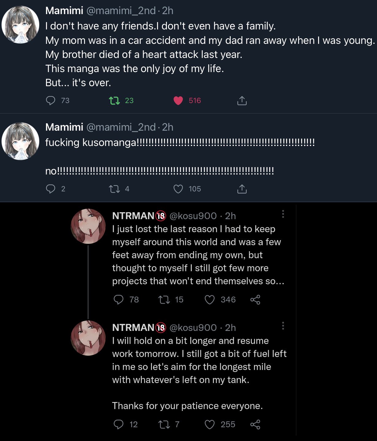 >>730697261both are big ntr artistsits just to show that most of them are mentally ill and/or close to suiciderecently sora (another big ntr artist) posted that he is now in the hospital due to several reasons