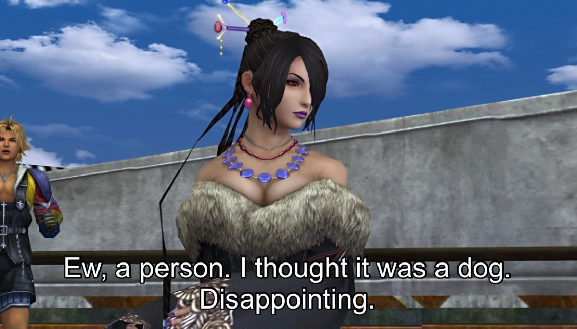 >>730681627>>730685302two good things with x2 is that wakka and the hag actually did have a child, and that the all-female combat is centered around wearing different pretty outfits>>730685910the game is on-rails, you were just handed better equipment through the story. it was completely braindead.it was so devoid of thinking that they didn't even put stuff on sidepaths, you just strolled on a straight line between locations and there was a glowing orb on the ground that you couldn't miss, then you pressed a button to get something better than the thing you already had. at most you needed to go to the blacksmith guy and press a button again.sidequest? just go to the highlight and press a button, then follow the highlight to the enemy, press your combat button and then teleport back to the quest giver. dead world, dead exploration.