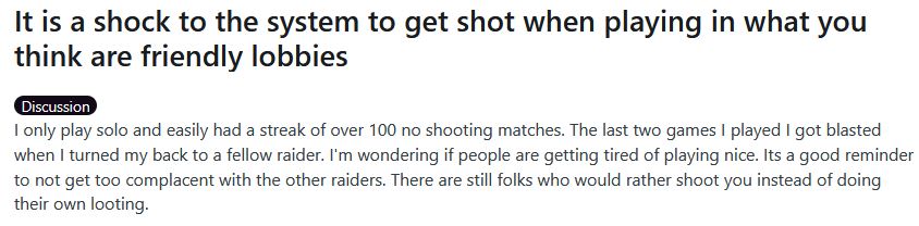 >>730713587The game will immediately pull you out of the quirk chungus lobbies if you dare to shoot someone once. So no unless you're willing to go suicide multiple games in a row to get put back into the daycare.If you're remotely interested in the PvPvE aspect of the game I'd recommend just staying away from this game because your lobbies will most likely just end up being 100% friendlies or 100% shoot on sight with nothing in-between.Gone are the days of this genres appeal being the organic player encounters where you never know who or what you're up against. You can just meta game it by observing your last few matches good boy points.