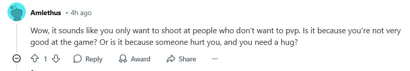 it's reddit it's that simplethey fucking LOVE "hehe pvp but not really" because they are all dogshit at anything slightly confrontational. It's the same thing in old school runescape, people get mad when you get killed in the wilderness when it's literally the entire purpose of itthey infested TF2 and this is basically the evolution of it