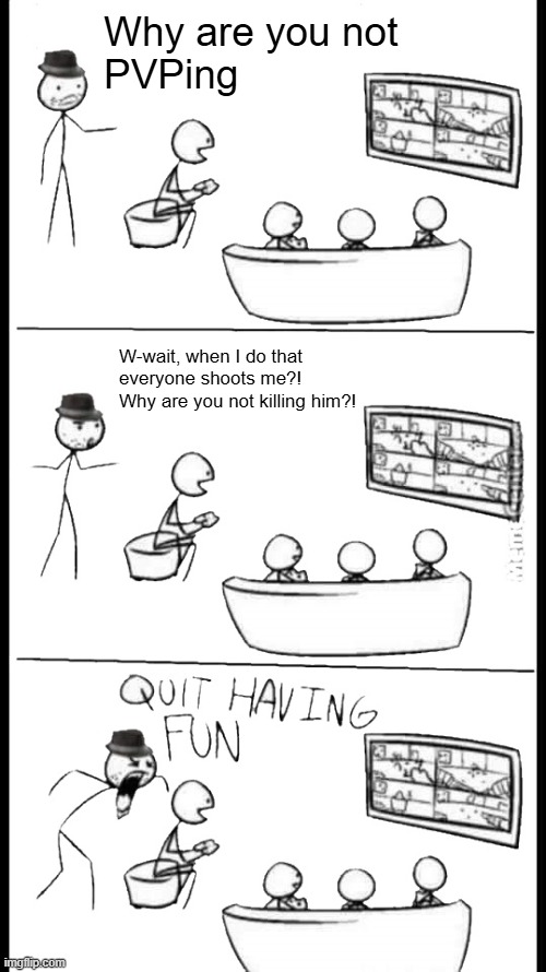 >>730707094took 10 seconds to make in an imgflip template>>730707149>stop ruining the online experienceruining what experience? me and the PVE players are having fun in our friendly lobbies chatting and having a blast! We even do PVP from time to time when someone starts murdering innocent playersWhy are you so upset about being placed in matches with other PVP lobbies anon? You have something to say? It's okay, just spit it out anon! It's okay to admit you just want to kill friendly players :)Sorry, but you wanted PVP, and you got placed in a PVP lobby, just like you wanted. You want the game to be PVP? There you go! Awww. So sad!