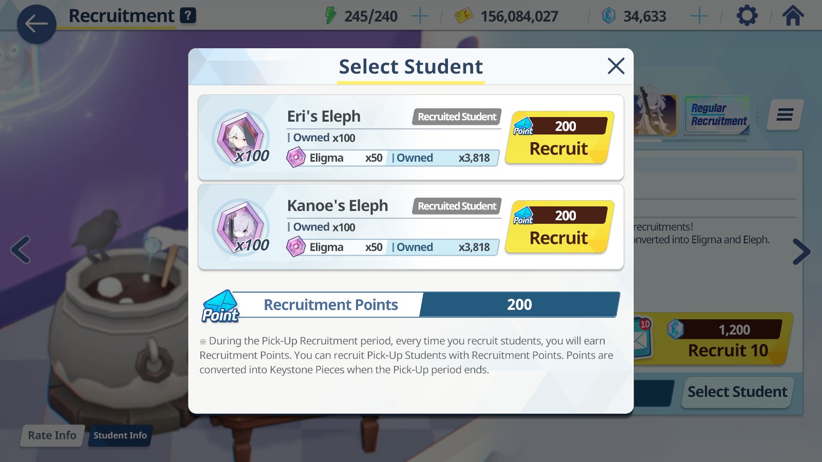 >>730722386>>730722526To explain the different currencies visible in the screen...>Top rowLeftmost green icon: Stamina, recovers at rate of 1 per 6 minutes. Stages usually take 10 stamina, main story stages don't take any.Middle yellow icon: Generic credits, used when leveling characters, gear, or buying stuff at ingame shop. NOT TIED TO REAL WORLD MONEY.Rightmost blue icon: Gacha currency, you can buy this if you want to, but you also get it from just playing the game.>Middle screenEri's eleph: Each character has their own elephs, which are basically shards which you can use to rank them up. You get these when pulling dupes, as very low chance from some dailies, or by exchanging...Eligma: You get these from pulling any duplicate characters, or from events. Basically makes it so that even if you don't get a dupe of a character, there's still viable way to uprank them.Recruitment points: Each time you do recruitment, you get these on one-to-one ratio. When you reach 200, you can recruit one of the currently featured characters, no questions asked, doesn't matter if you got them previously or not.