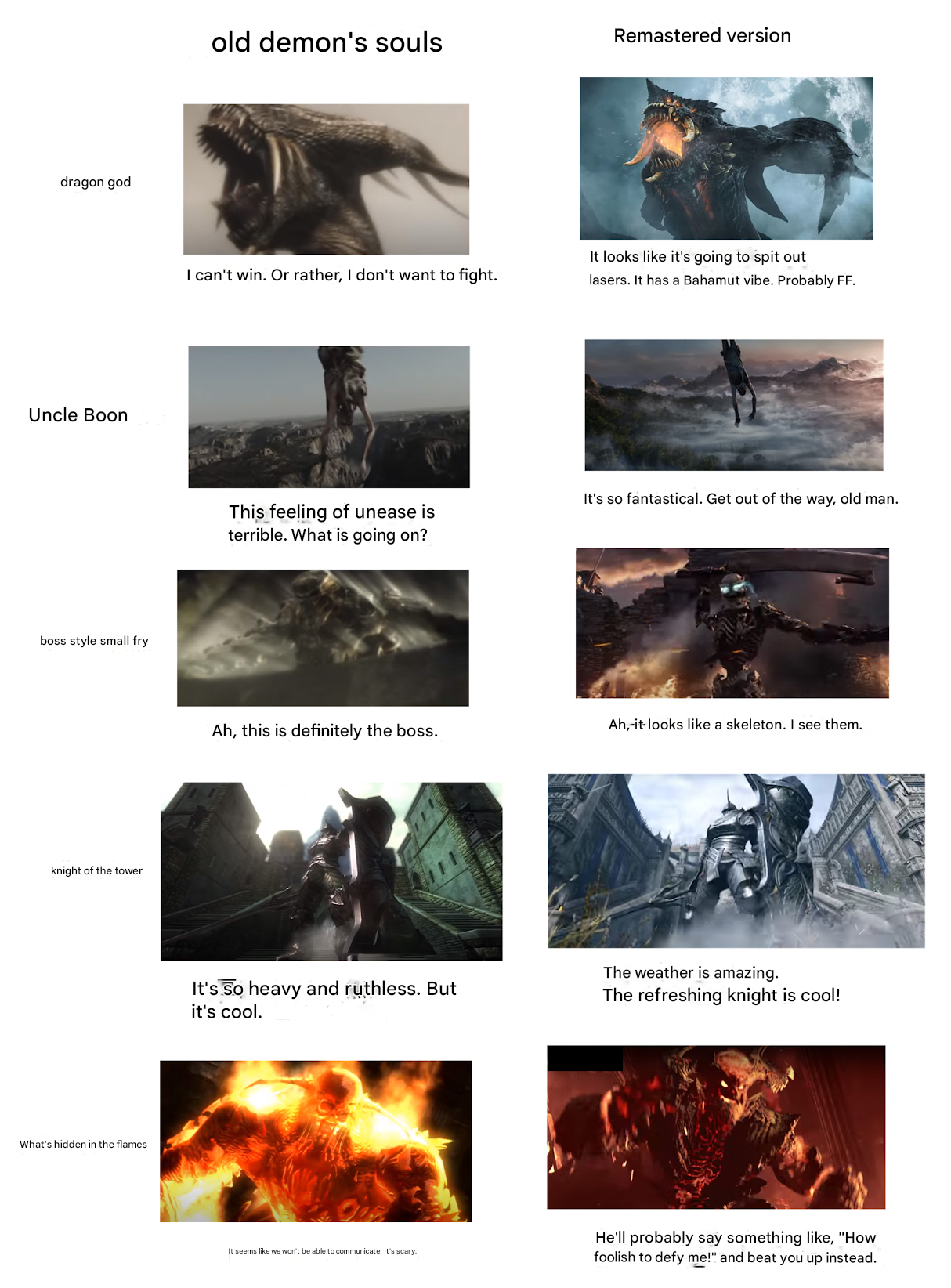 >>730716431Again you are nostalgy tripping, i playd dark souls as first souls game then des, and das was better every way, i own ps3 and original des and would never play it instead of remake that actually plays smoothly, but i do pick original ds fix prepare to die edition over remaster