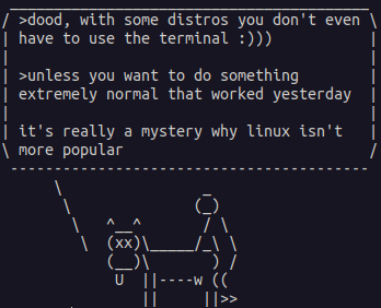 >dood, with some distros you don't even have to use the terminal :)))>unless you want to do something extremely normal that worked yesterdayit's really a mystery why linux isn't more popular