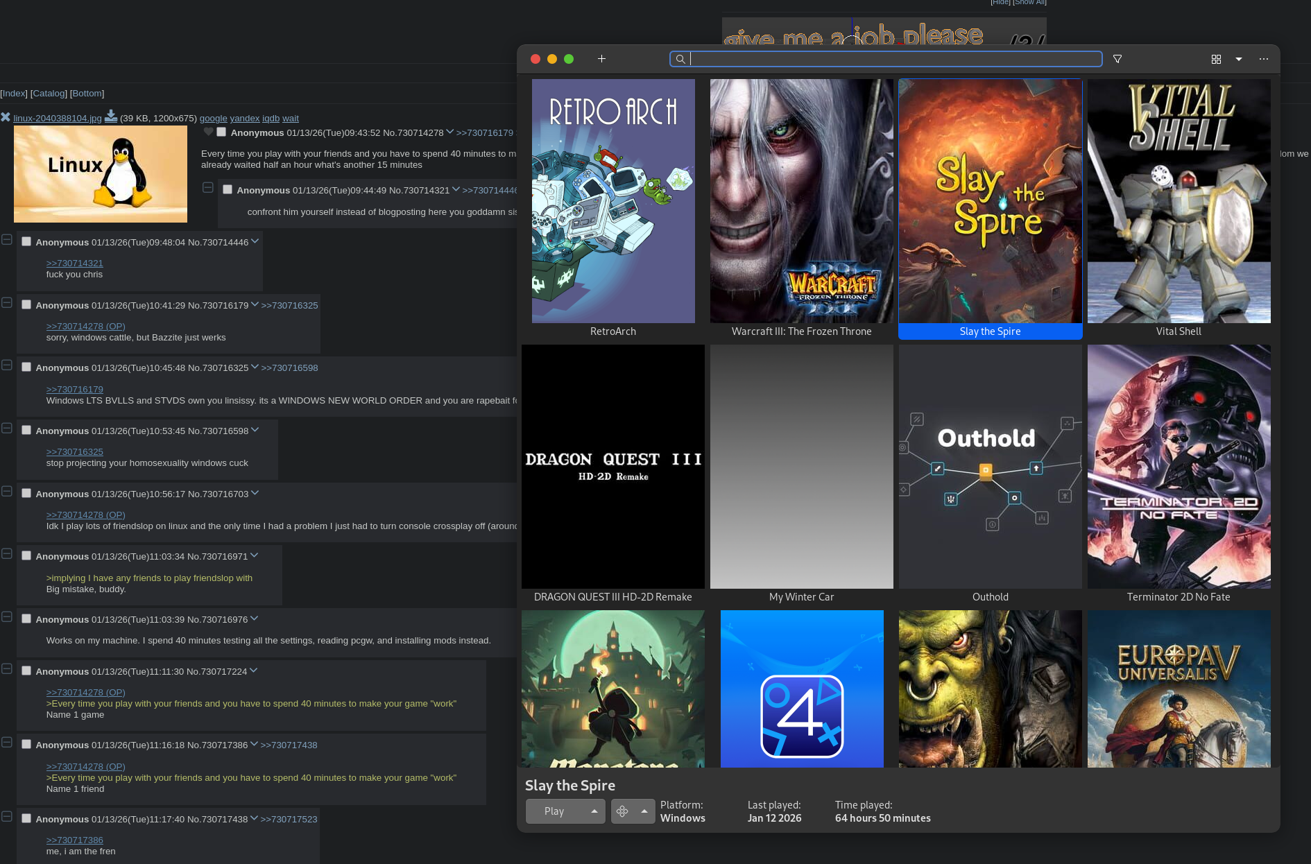 >Friends want to play a shitty game like GTA:Online, or Arc Raiders or the newest hero shooter moba>Start making up excuses how they don't work on Linux so I don't have to play garbage and waste my time on dead by daylight or marevel rivals