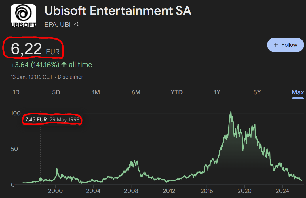 >>730719537>since the 2010's>they are almost worth as much as they were BEFORE they started maiking Asscreed and Farcry