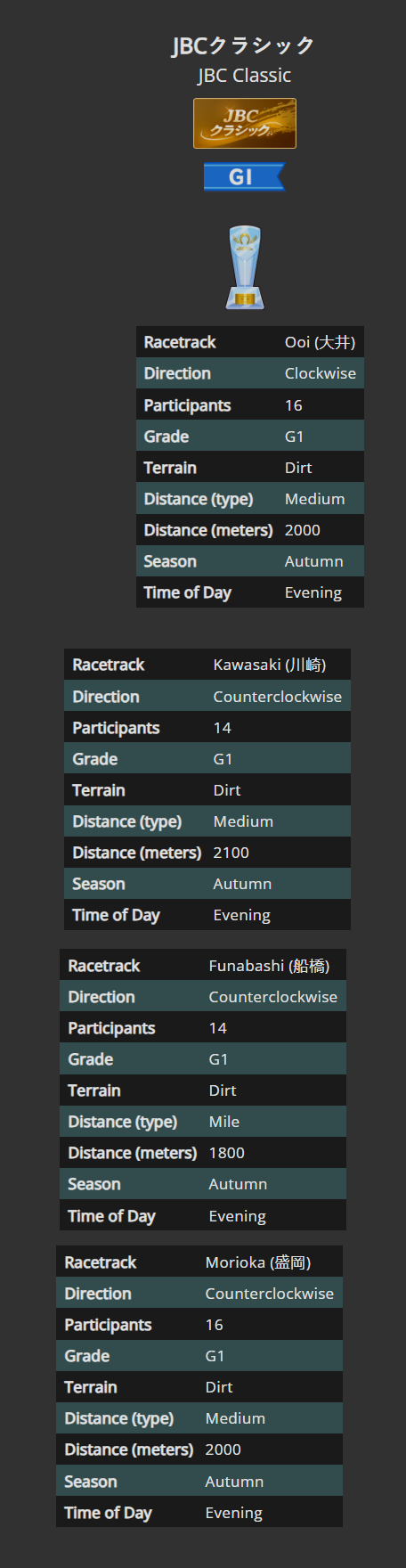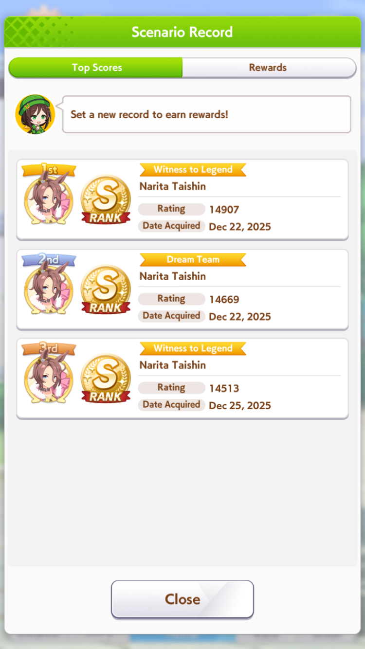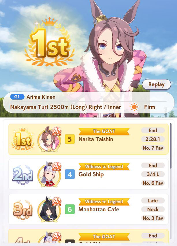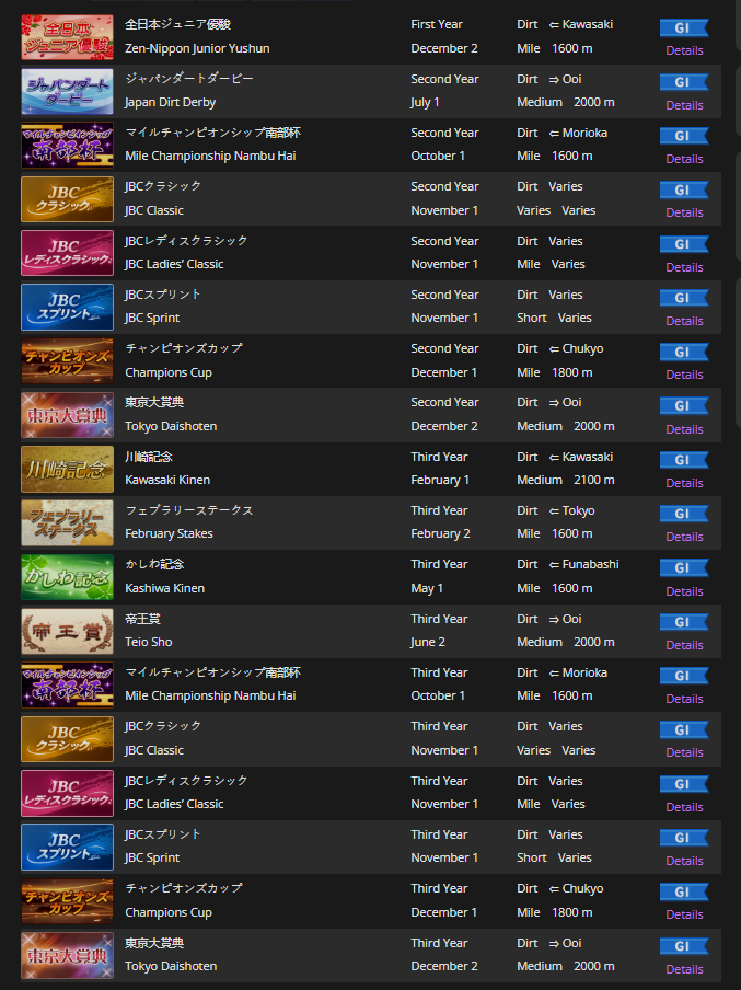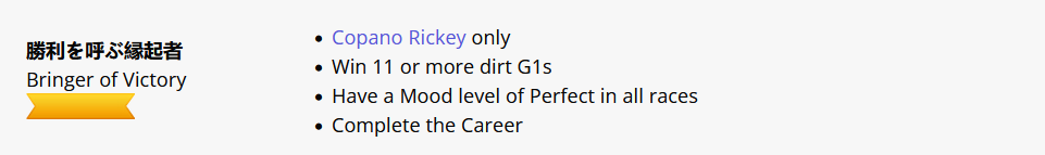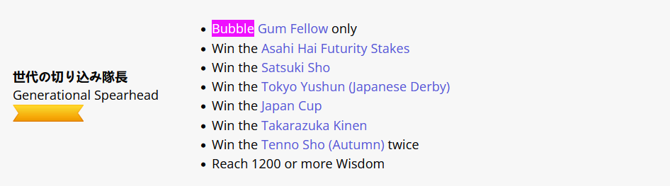 >>730760492>Monster in the Shadows>Win the Satsuki Sho with a difference of at least 3 1/2 lengths>Win the Tokyo Yushun (Japanese Derby) with a difference of at least 5 lengths>Win the Kikuka Sho with a difference of at least 7 lengths>Win the Arima Kinen twiceI mean its challenging but I got quite a few Kikuka Sho Distance wins by getting a gold recovery