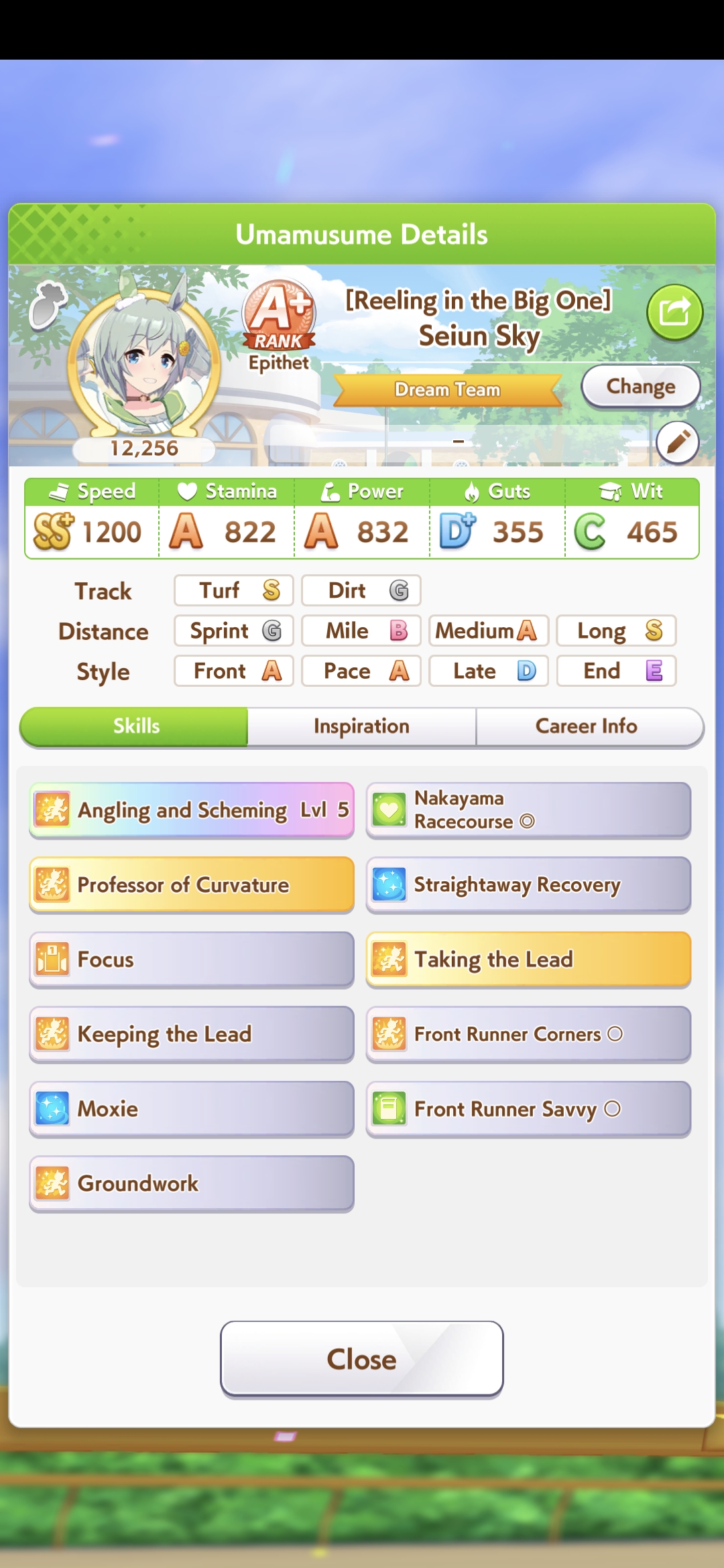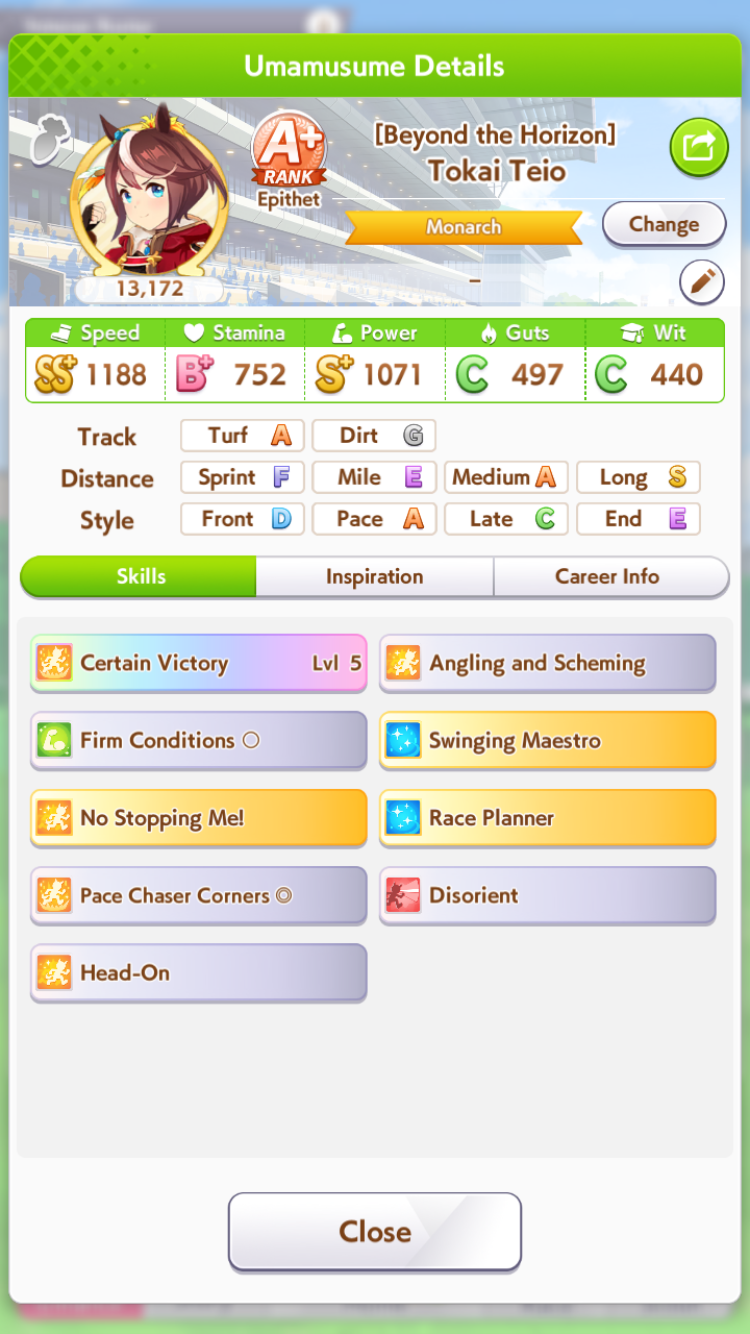 >>730760269>>>pace is competing with xoguri so it HAS to be goodborrow MTG and gamble on head-on. It's a great speed card so it's worth running on your ace. Will make it way easier trust me. then borrow a seiun parent. Don't worry about groundwork bullshit. Only need one gold heal. Probably want a little more stamina than the rest of your team. Want early (shrewd step, prudent positioning) and mid-race skills (corners, straights, tail held high, curvature, ramp-up/it's on, ignited/burning speed). Then for late race accel you grab No Stopping Me and hopefully combo that into angling. Can also grab Ignited/Burning Power if that pops up.As for other late race skills you'll want some kind of velocity boost near the finish line. Homestretch haste if you can't find anything else. Is Rudolf's ability worth running on pace? Triumphant pulse? I'm not quite sure.