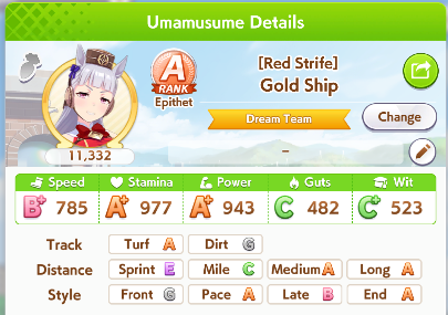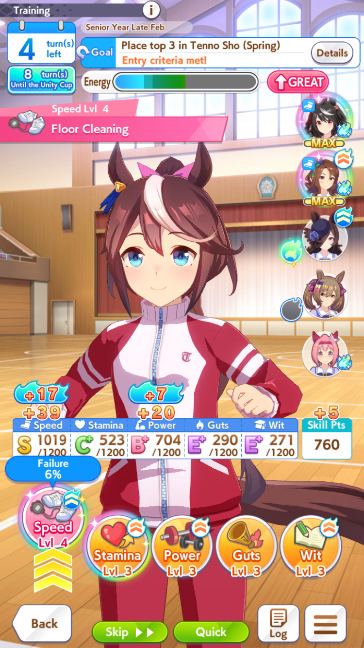 >>730761526Not him but how could you possibly ever get enough stamina with 2 speed 3 wit? I can't even get 900 with stam sparks, and 2 stam bonus cards on a stam growth uma