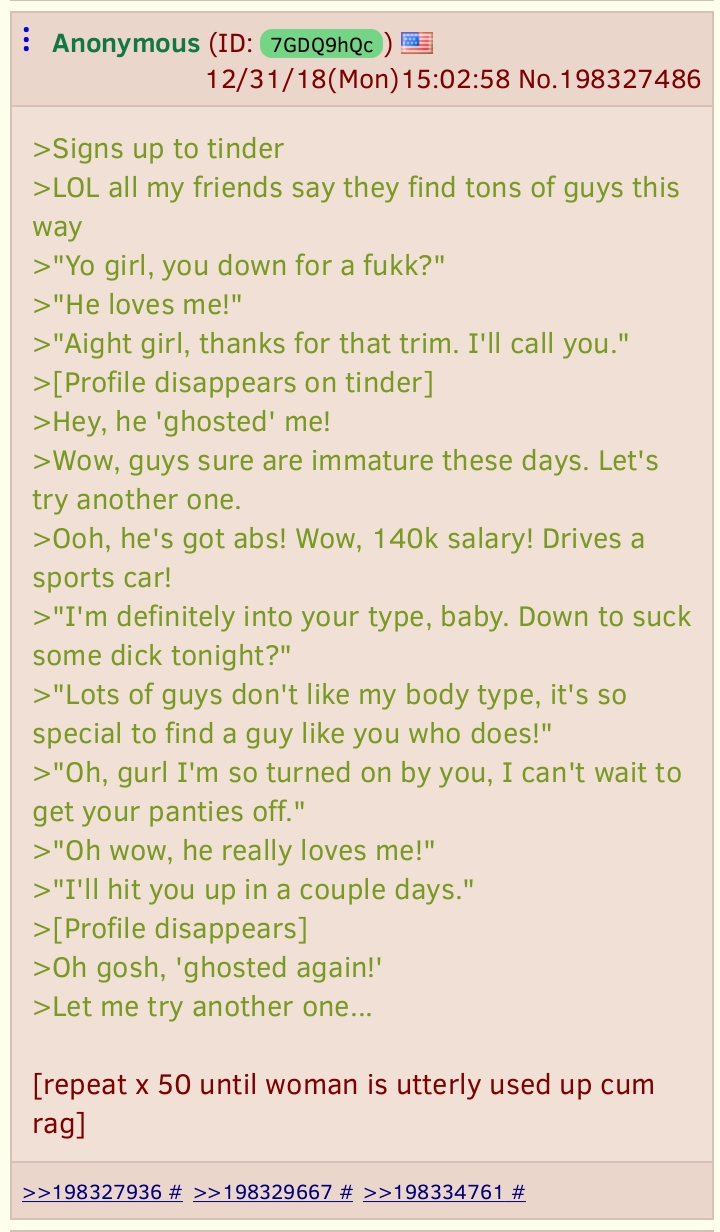 >>730758984notice also that bitter roasties like >>730758178 and >>730758765 that immediately freak out about this tooeven those hideous hamplanets could get married to a 10/10 Chad if they could only be nice instead of attacking him over his "toxic masculinity," but they literally, willfully, unironically can't just be nice, so all they get is a pump-and-dump