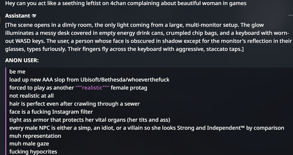 >>730787251That's the thing. I don't know but if does something I don't want I can simply rectify and tell the AI what I want to hear. You are missing my point. I don't want WANT to write my own stories. I dont want to create a story to sell to people but create my own personal entertainment and I want an immersive CYOA experience where I also have a lot of input, much more so than crpgs where at most I only have 5 options with maybe 2 real choices while the others are just fluff and you are still at the mercy of the game's writers.>AI chatbot tells me that we are scouting for a hill over the enemy forces>I can either, make it so that I send my royal vanguard to comb over the hill>Ignore the AI chatbot and tell him/her that we have no time and simply charge over the hill>Go fucking bonkers and say that a god manifested itself over our ranks and we just demolish the entire opposing army through divine favor