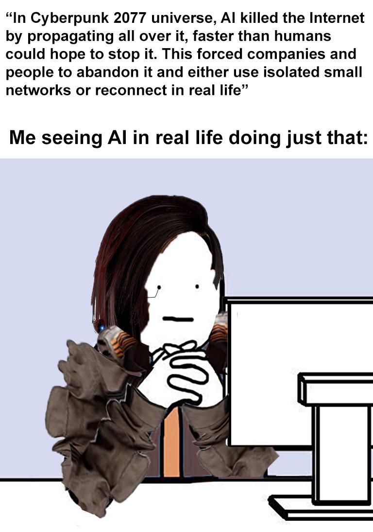 >>730769781i've thought about this, too. you never see futuristic dystopian stuff filled with slop. even cyberpunk 2077, which came out only 2 years before chatgpt's main release, didn't have slop overload. there were a lot of advertisements in cyberpunk fashion, but it wasn't like showing how everything would turn into AI slop both in writing and ads and images etc.same with any other movie I can think of. no "slop" fest type shit in star trek, robocop, blade runner, whatever.