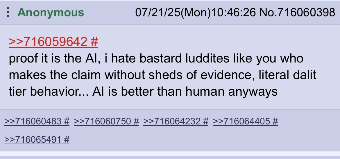 >>730784048>AI WILL TAKE OVER INDUSTRY AND I WILL FINALLY BECOME A MILLIONAIRE AND ESCAPE MY POO-SMEARED HUT REEEEEEKeep spamming the word "luddite", maybe it makes the AI bubble go away.
