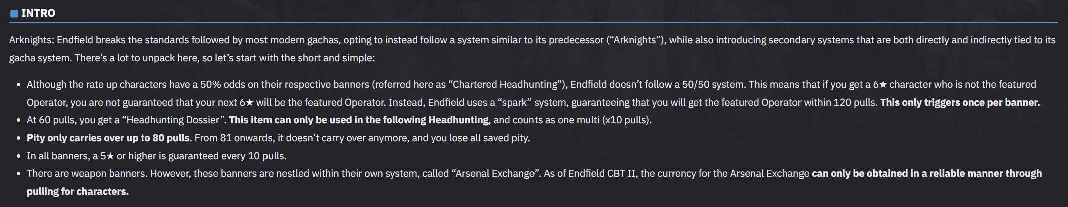 >>7307882191.45% rates for the rate upNo dupe system200 rolls you get to grab the character on rate up outright (spark/hard pity whatever you call it)No 50/50 shenanigansRelated to this is the dispenser system.So after a units been out for a week it goes into the dispenser.You can use a shard currency earned through rolling and grinding endgame.So effectively if you dont roll for a guy that guy is available to grind for permanently after week delay.The nutty thing is the endgame is pretty much you farming shards to build up a collection. (99% complete collection is possible [the 1% is the arknights collab stuff lol])The grind takes a while but it also mostly solves FOMO which is a big deal, at least for me.Its like the commendation store in arknights but all old ops are available for purchase always and you earn more of the currency via IS runs.One caveat is you can't get guy from the last season (battle pass) but once the next battle pass comes out those guys get added to the dispenser permanently.