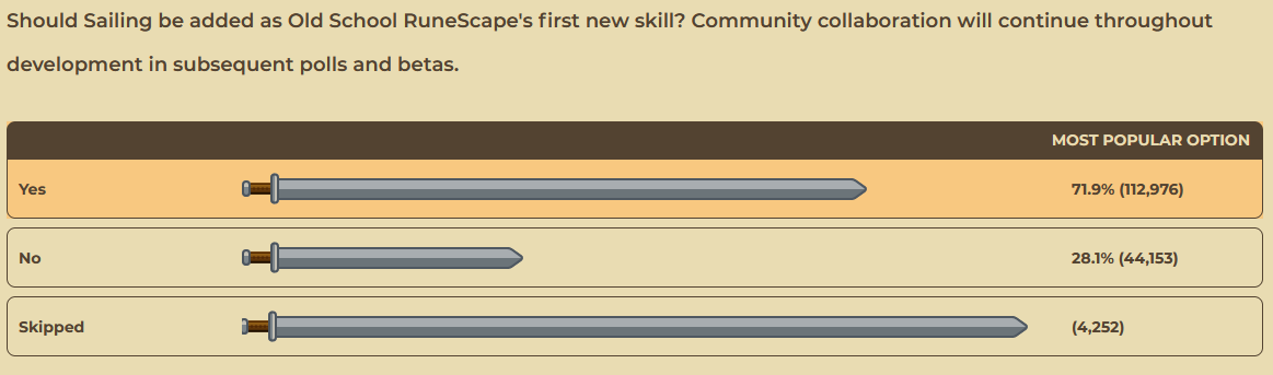 >>730779707>ask if players want sailing>no>ask if players want a new skill>okay>ask to choose between three shit skills>sailing seems the least bad i guess>barely passes (sub-75% approval, would not have passed if they had asked years ago)yes... very convincing