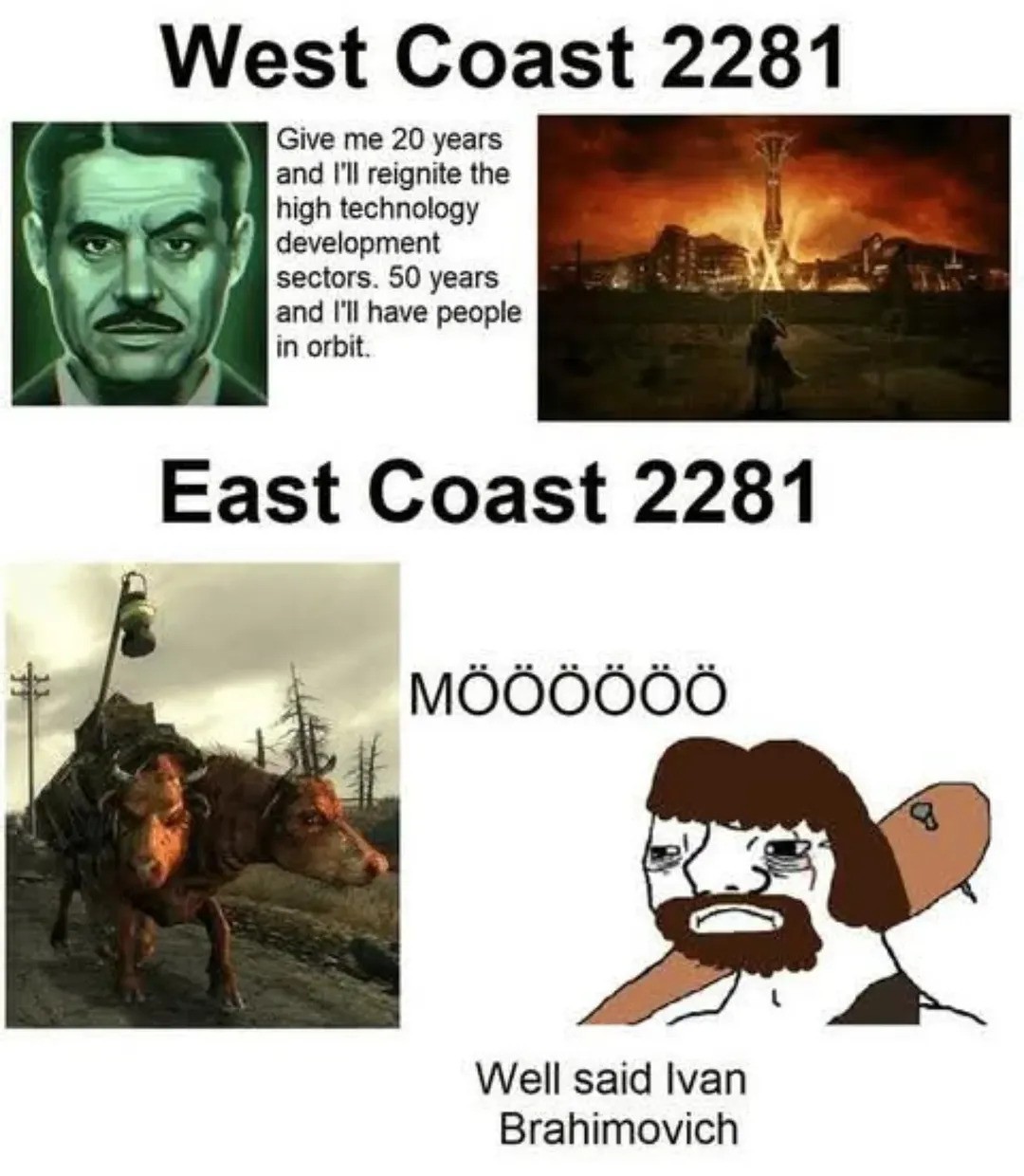>>730786510Yeah this see is the problem, normalfags are preprogrammed to think what post apocalypse is and get angry if it is different than what they expected>>730786484Pic rel